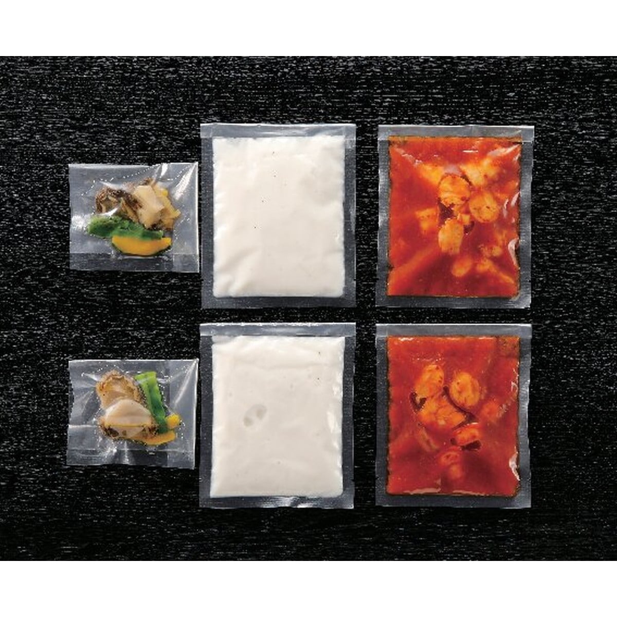 ●数量・内容:伊勢海老チリソース150g×2、あわびクリーム煮スープ(あわび10g(ボイル南瓜・アスパラ入)、クリームスープ160g)×2