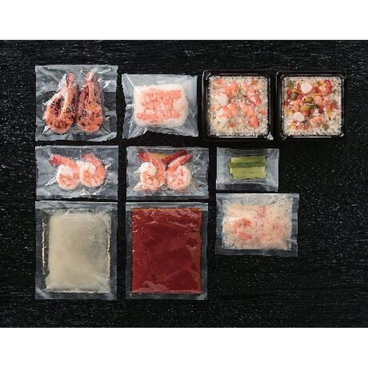 ●数量・内容:天然足赤えびの塩焼き(20g×2)、天然足赤えび葛汁(海老20g、葛汁160g)、天然足赤えび炊き込みご飯(2尾入)180g、天然足赤えびのブイヤベーススープ(海老20g(黄パプリカ・赤パプリカ・ピーマン入)、ブイヤベース150g)、天然足赤えびのピラフ180g、天然えびとアスパラのバター炒め(海老とバターソース60g、ボイルアスパラ)、天然えび棒寿司(ハーフ)100g