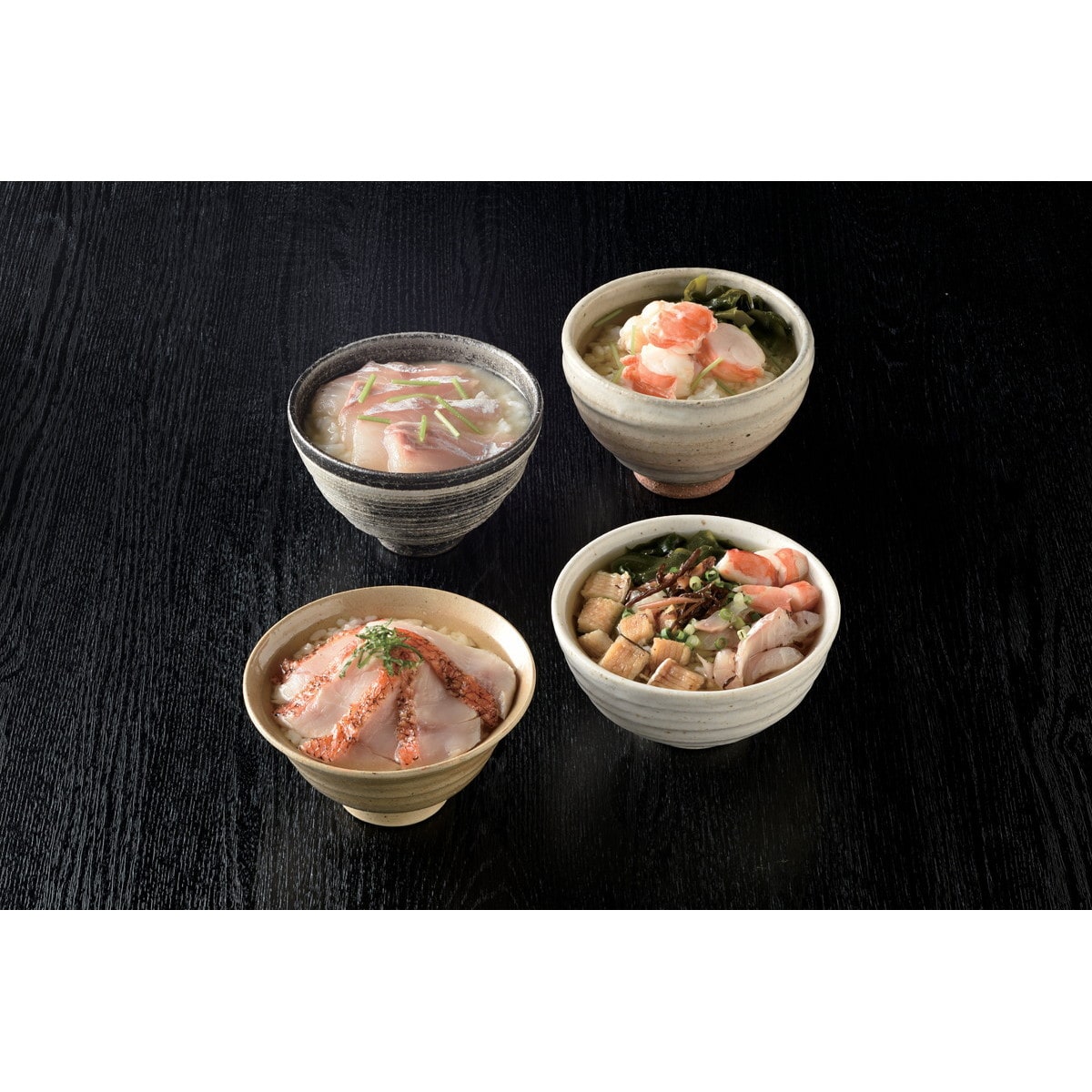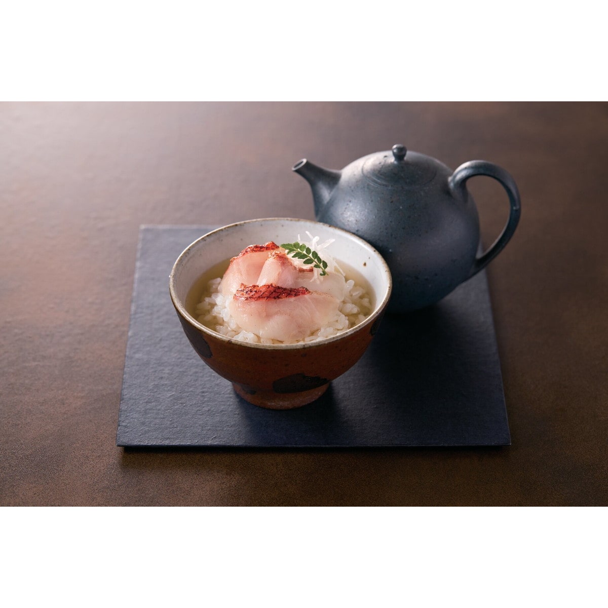 「懐石茶漬け」 白みそ仕立ての「鳴門鯛」、鰻を鰹だしで食す「鰻鰹」、焼き上げた太刀魚を胡麻鰹だしで仕立てた「太刀魚胡麻」、醤油漬けした鰹の「鰹醤油」、伊勢海老と伊勢海老スープの「伊勢海老」、 金目鯛を炙った「炙り金目鯛」、天然の海藻、鯛、鱧、海老を使った「海鮮茶漬け」の詰合わせ。国産魚介の贅沢茶漬けです。