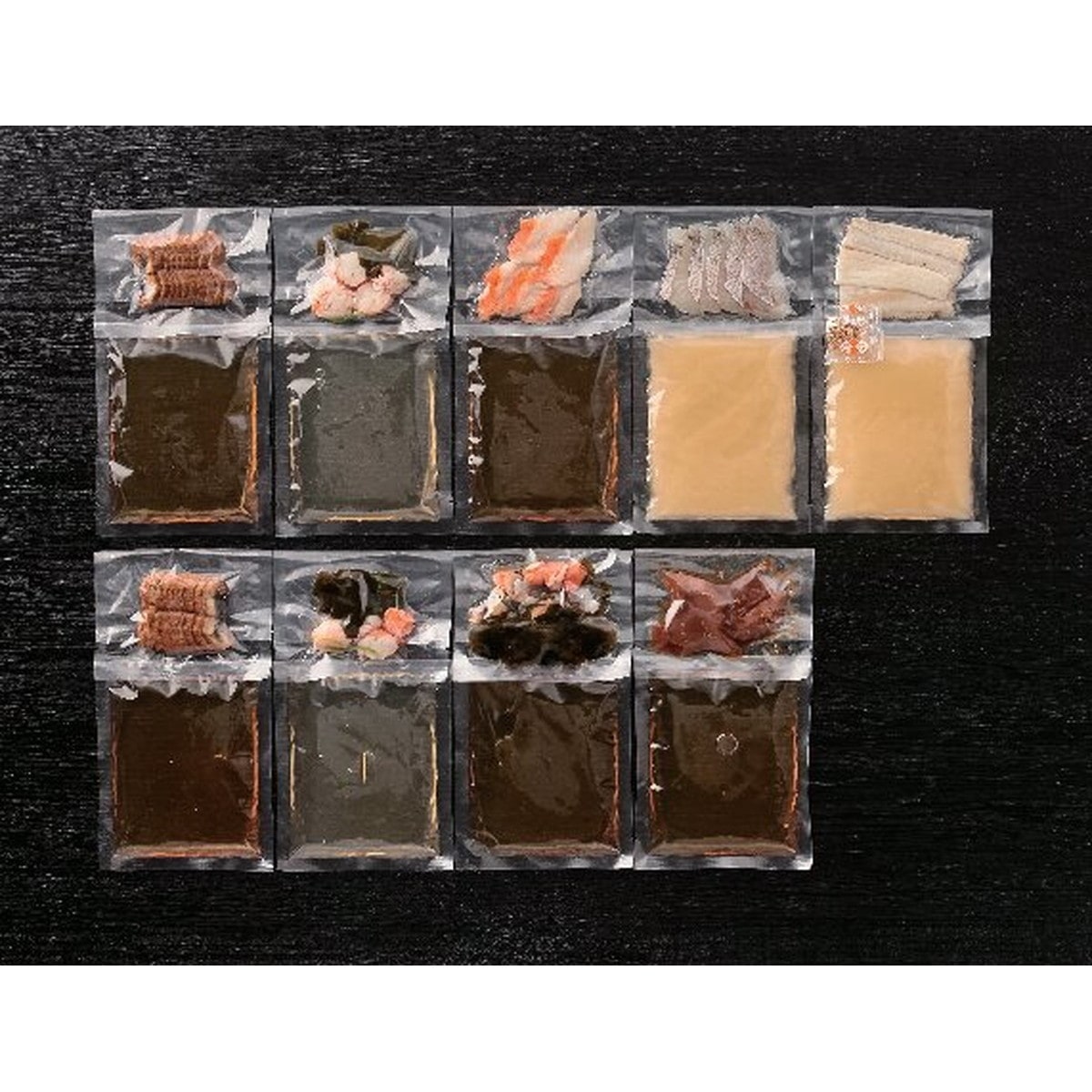 ●数量・内容:鰻鰹だし仕立て(鰹30g、出汁180g)×2、伊勢海老スープわかめ仕立て(伊勢海老25g(湯通しわかめ・みつば入)、出汁180g)×2、鳴門鯛白みそ仕立て(鯛30g、出汁180g)、太刀魚胡麻風味仕立て(太刀魚15g、出汁180g、ごま)、鰹醤油仕立て(鰹30g、出汁180g)、炙り金目鯛茶漬け醤油仕立て(炙り金目鯛30g、出汁180g)、海鮮茶漬け鰹だし仕立て(鱧照焼き・えびむき身・鯛・湯通しひじき・湯通しわかめ計30g、出汁180g)