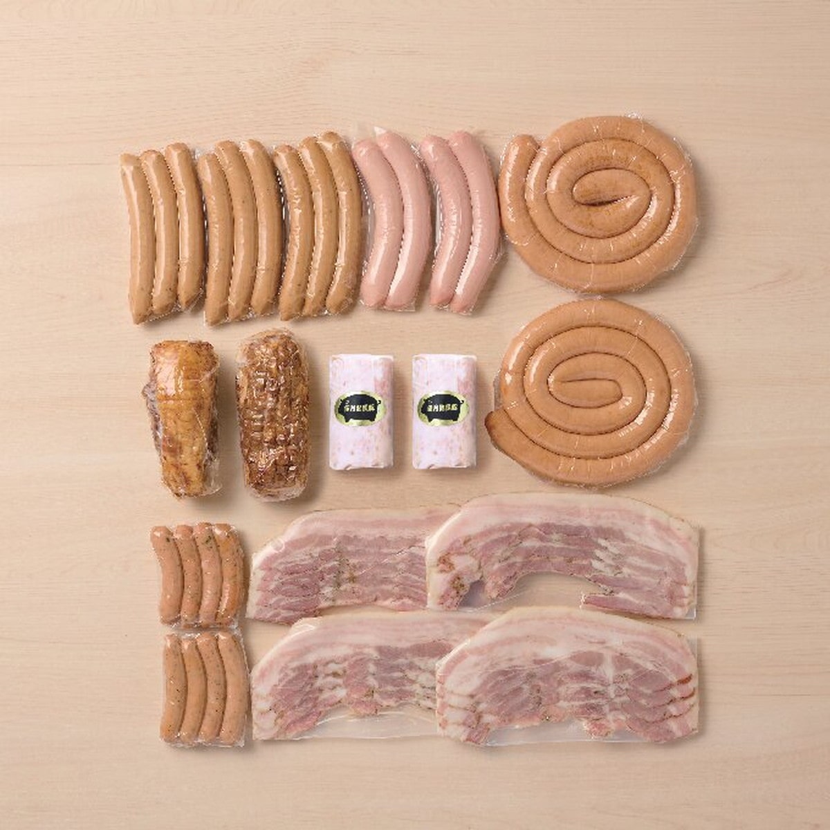 ●数量・内容:無塩せきウィンナー120g×3、無塩せきバラベーコン90g×4、無塩せきバラチャーシュー250g×2、屋久島茶葉入りウィンナー100g×2、ボロニア180g×2、羊腸フランク120g×2、ぐるぐるウィンナー400g(約80cm)×2
