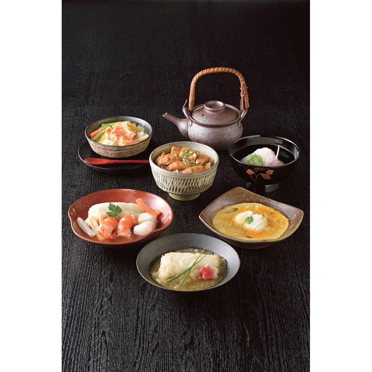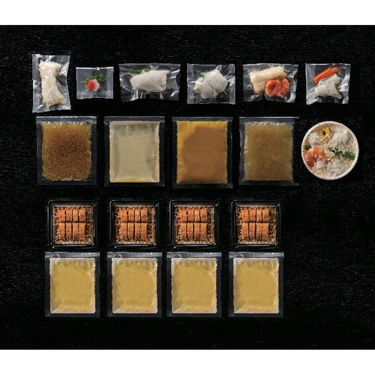 ●数量・内容:鱧と生麩のみぞれ煮(鱧40g、梅麩・みつば、大根おろし入出汁135g)、鱧の吸い物(鱧40g(みつば入)、出汁140g)、鱧と鱧子の柳川鍋風(鱧40g(みつば入)、鱧子の柳川鍋風出汁(ごぼう入)150g)、鱧と海老のグラタン180g、鱧と海老の中華あんかけ(鱧と海老60g、湯通し野菜(小芋・筍・大根・みつば)20g、中華あん120g)、鱧のひつまぶし風ごはん(鱧ひつまぶし180g、〆出汁スープ150g)×4