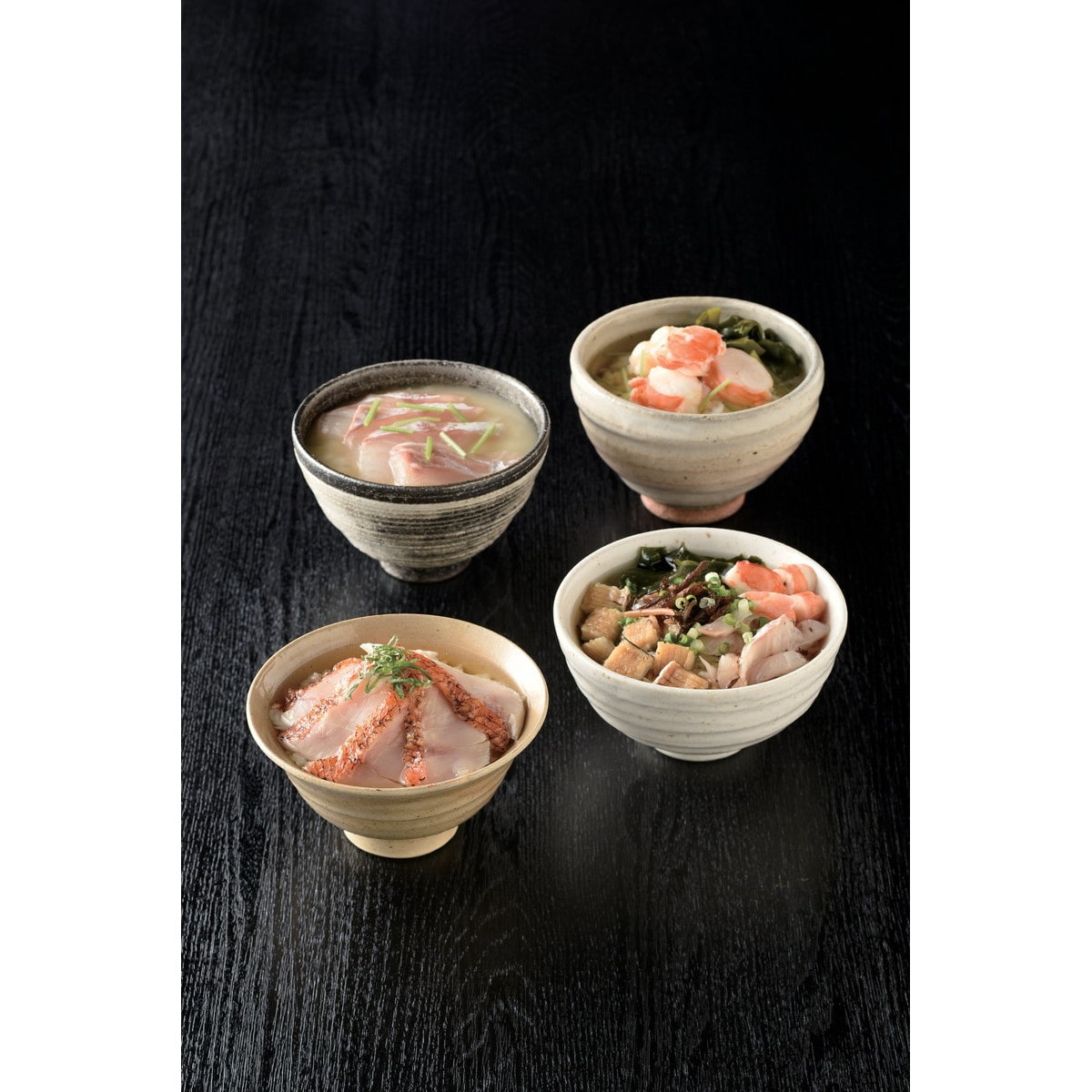 「懐石茶漬け」 白みそ仕立ての「鳴門鯛」、鰻を鰹だしで食す「鰻鰹」、焼き上げた太刀魚を胡麻鰹だしで「太刀魚胡麻」、醤油漬けした鰹の「鰹醤油」、伊勢海老と伊勢海老スープの「伊勢海老」、金目鯛を炙った「炙り金目鯛」、天然の海藻、鯛、鱧、海老を使った「海鮮茶漬け」の詰合わせ。国産魚介の贅沢茶漬けです。