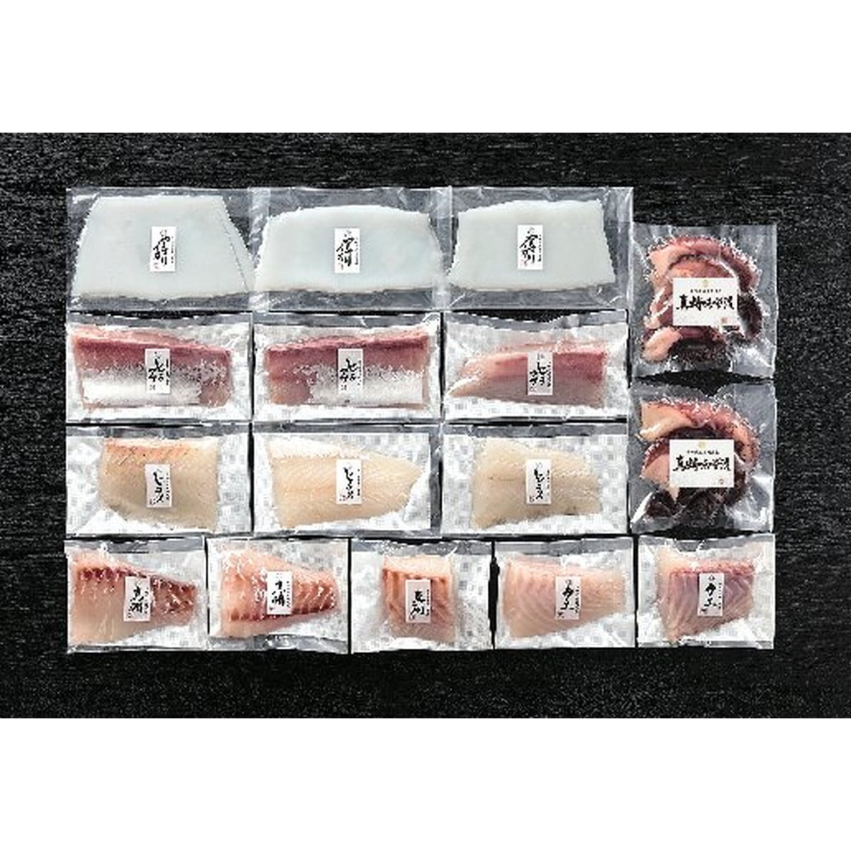 「柵造り盛合せ イカ・タイ・ヒラマサ・ヒラメ各100g×3、クエ100g×2、タコ味噌漬200g×2」 美しい海と豊かな自然に恵まれた長崎五島列島。四季折々の味覚が楽しめる食材の宝庫です。