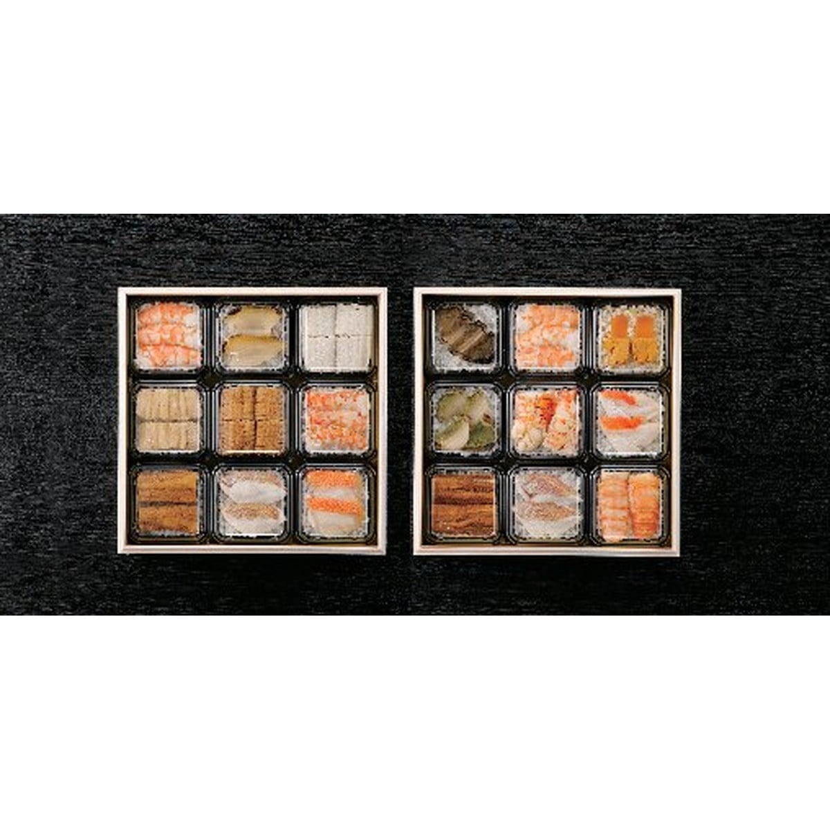 ●数量・内容:箱寿司 雅珠9種各90g(鰻、煮穴子、天然足赤えび、天然焼鯛、焼鱧、煮あわび、炙り金目鯛、天然焼足赤えび、湯引き鱧)、宝珠9種各90g(鰻、蒸しあわび、焼きあわび、ボイル伊勢海老、焼伊勢海老、天然足赤えび、天然焼鯛、炙り金目鯛、蒸しウニ・からすみ)