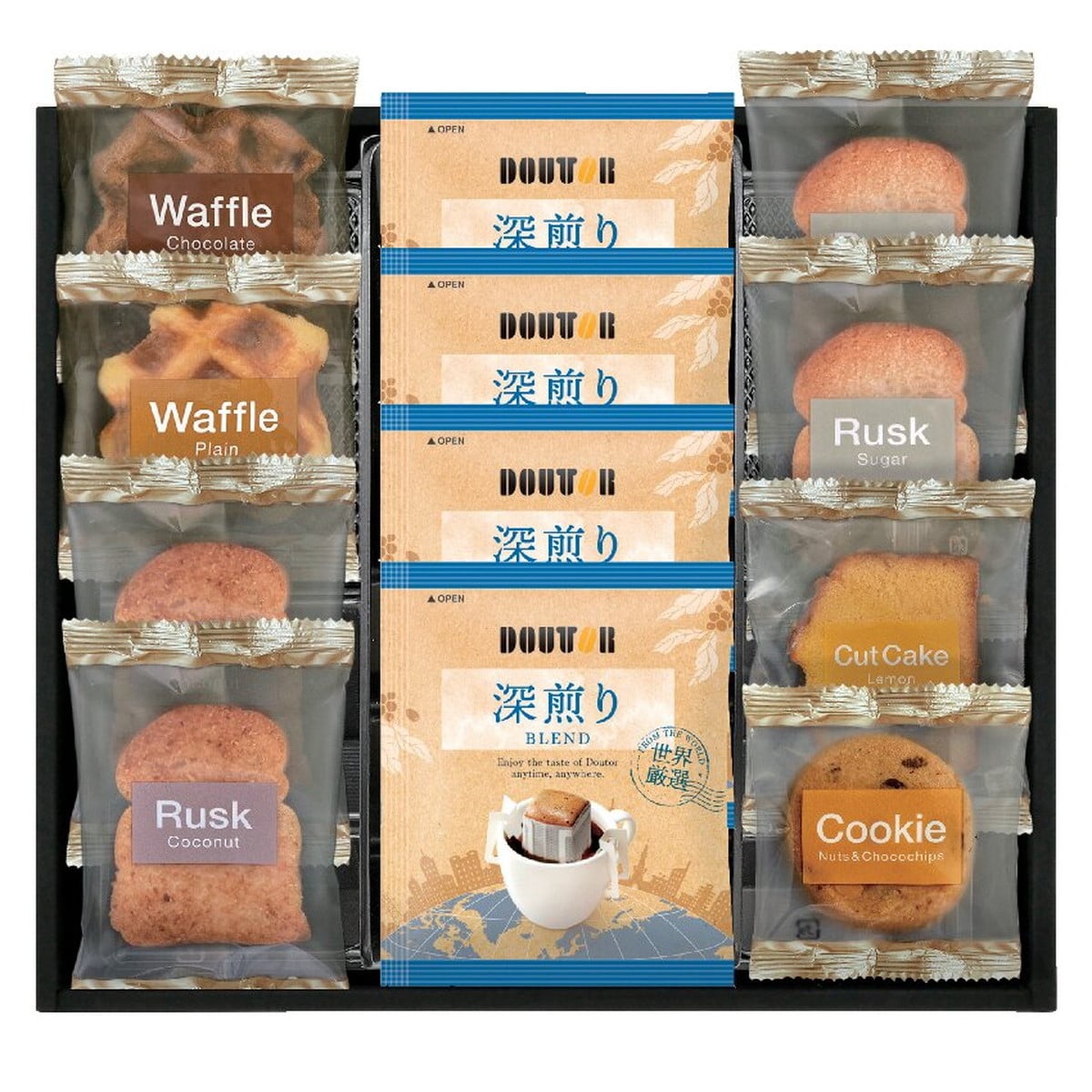 ●数量・内容:ドトールドリップコーヒー7g×4、ラスク(シュガー・ココナッツ)×各2、ワッフル(プレーン・チョコ)×各1、ナッツとチョコのざっくりクッキー・レモンケーキ×各1