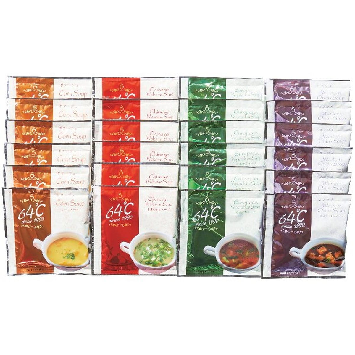 「64℃ スープギフト」 スーパースイートコーンの豊かな甘味を楽しめるコーンスープ、トマトの旨味が溶け込んだ欧風野菜スープ、濃厚な味わいの洋風オニオンスープ、鶏がらのこくと白ごまの香ばしさが美味しさを引き立てる中華わかめスープ。4種のスープをご賞味ください。