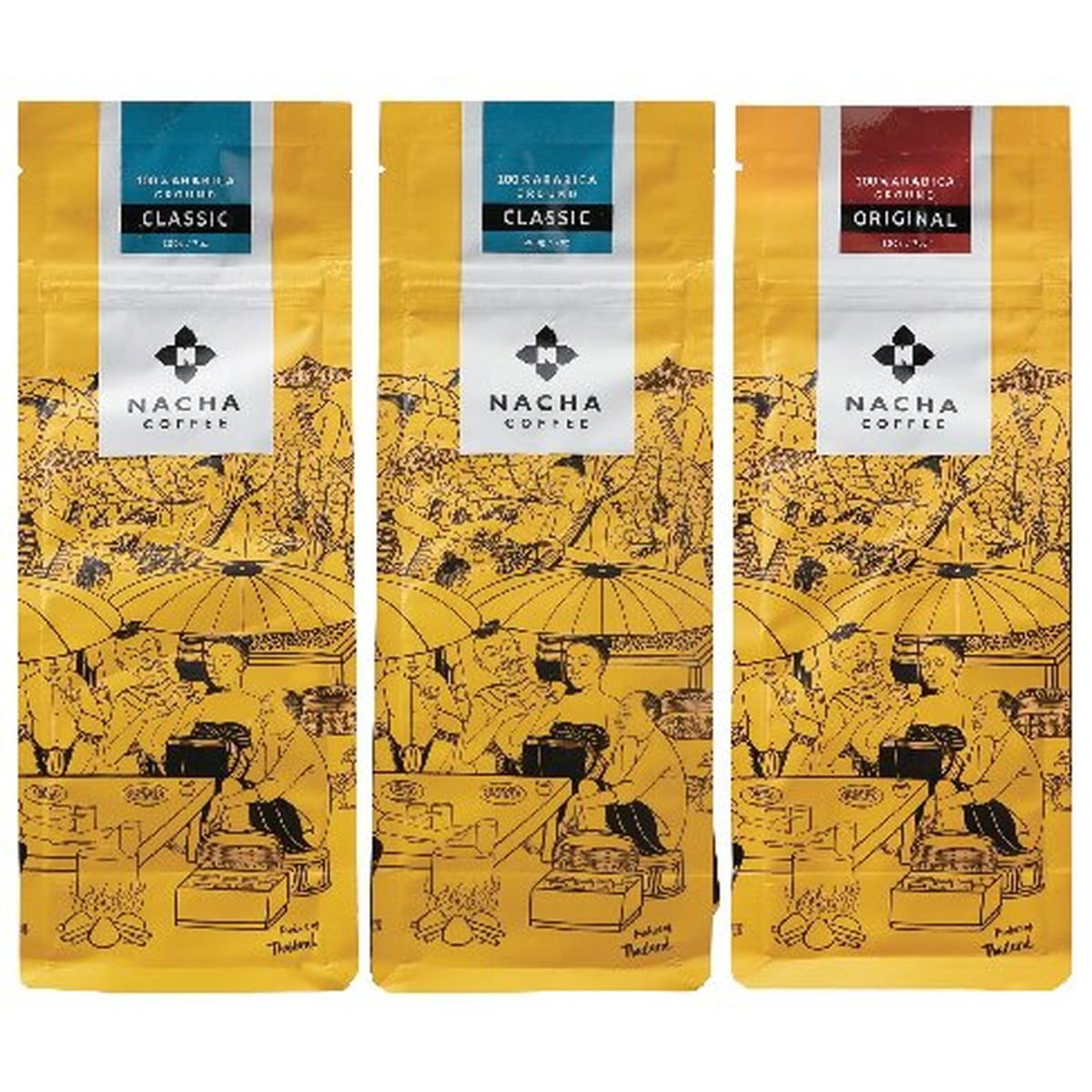 「<NACHA COFFEE>コーヒー詰合せ」 タイの原生林から生まれたナシャ(NACHA)珈琲は、深煎りせずとも、飲み終えた後に喉の奥から香りが蘇ってきます。