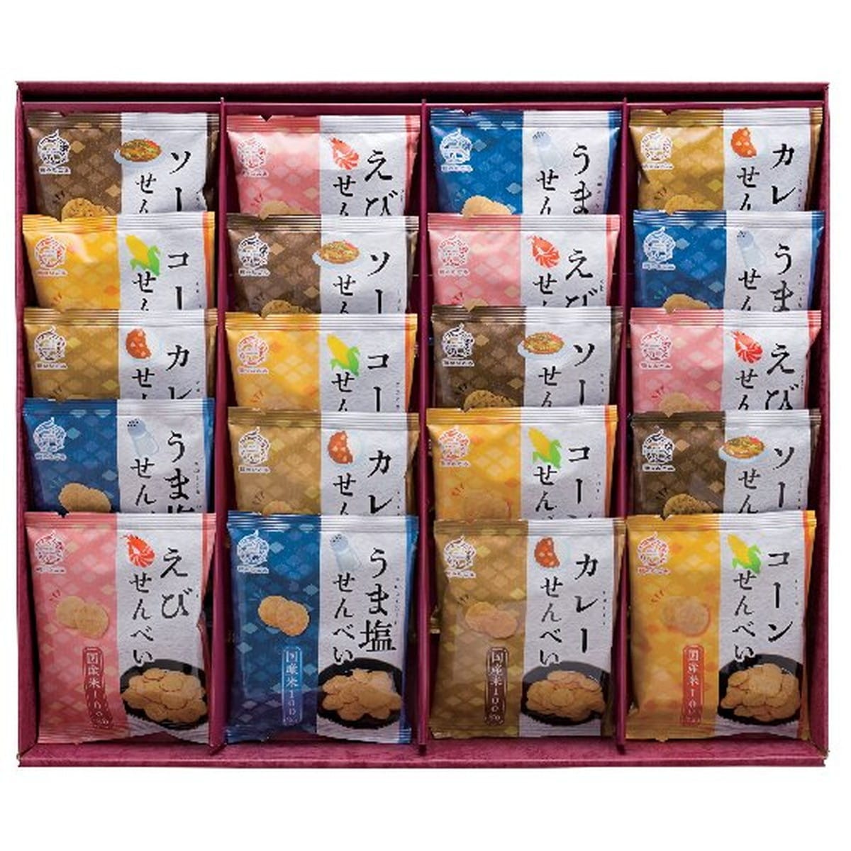 ●数量・内容:えびせんべい・コーンせんべい・うま塩せんべい・ソースせんべい・カレーせんべい各15g×4