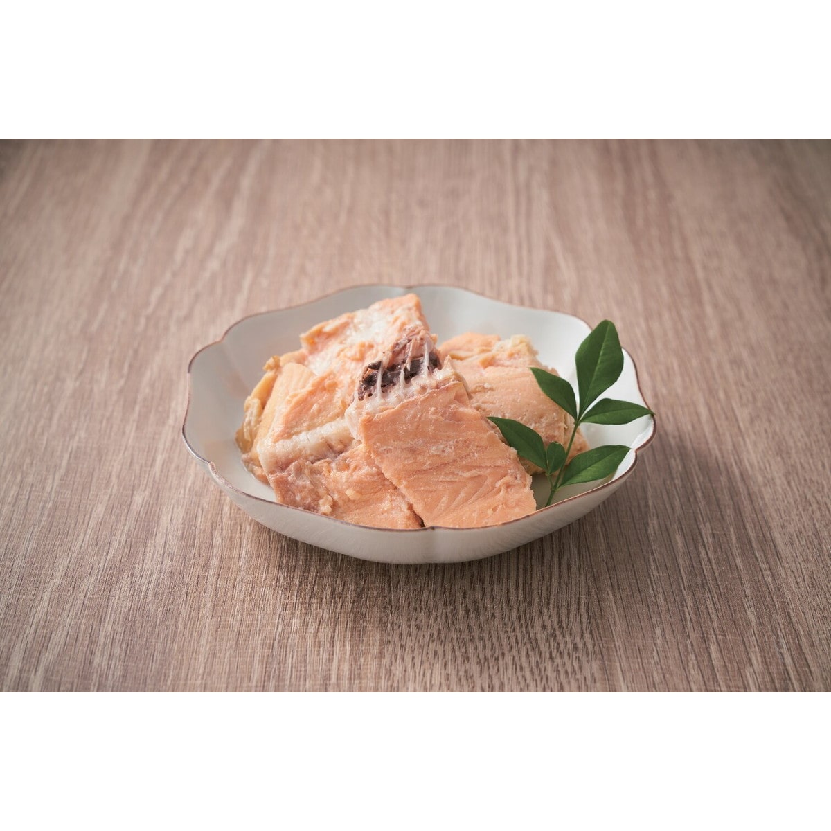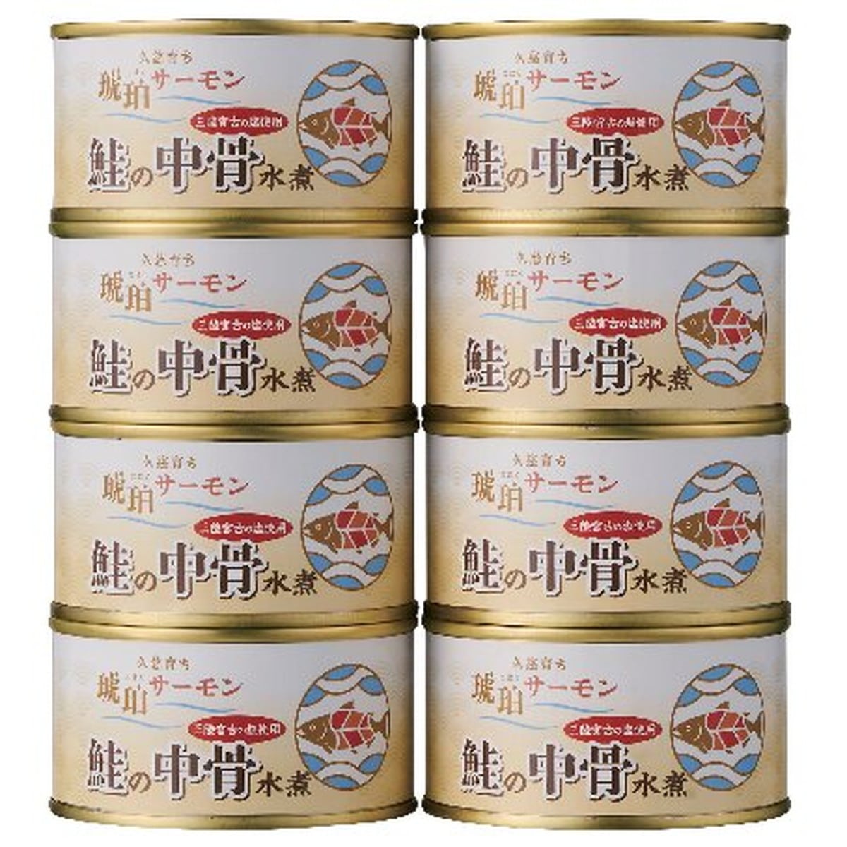 「琥珀サーモン鮭の中骨水煮(久慈育ち) 180g×8」 岩手県のブランドサーモン「久慈育ち琥珀サーモン」の中骨を三陸宮古の塩を使用して水煮に仕上げました。優しい味付けの柔らかい鮭の身をご堪能いただけます。