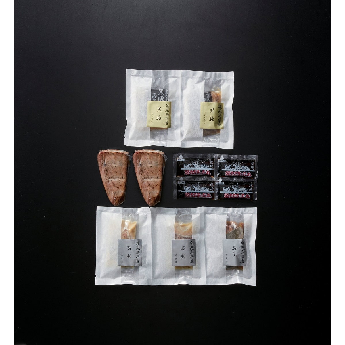 ●数量・内容:黒豚モモ味噌漬70g×2、鰹たたき400g(計2~3本)、鰹たたきタレ×4、真鯛西京漬60g×2、ぶり幽庵漬70g×1