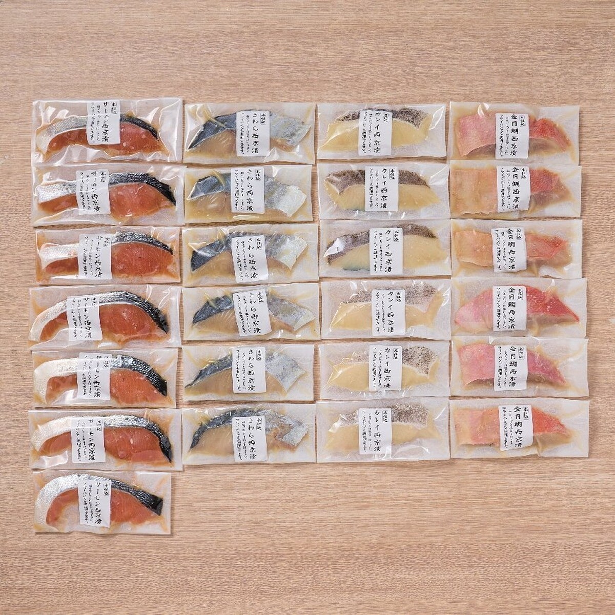 ●数量・内容:サーモン(銀さけ)80g×7、さわら・金目鯛・カラスガレイ各80g×6