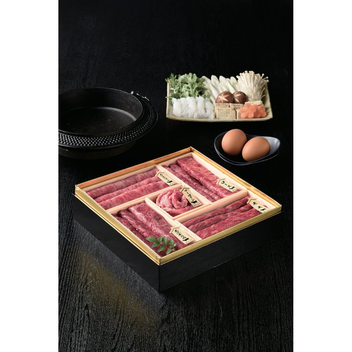 「米沢牛・黒毛和牛 すき焼き用 詰合せ御膳 150×4/80×1」 「米沢牛」「鹿児島県産黒毛和牛」のバラエティー豊かな美味しさが楽しめる贅沢なすき焼きセットです。会席にも映える御膳箱でお届けします。