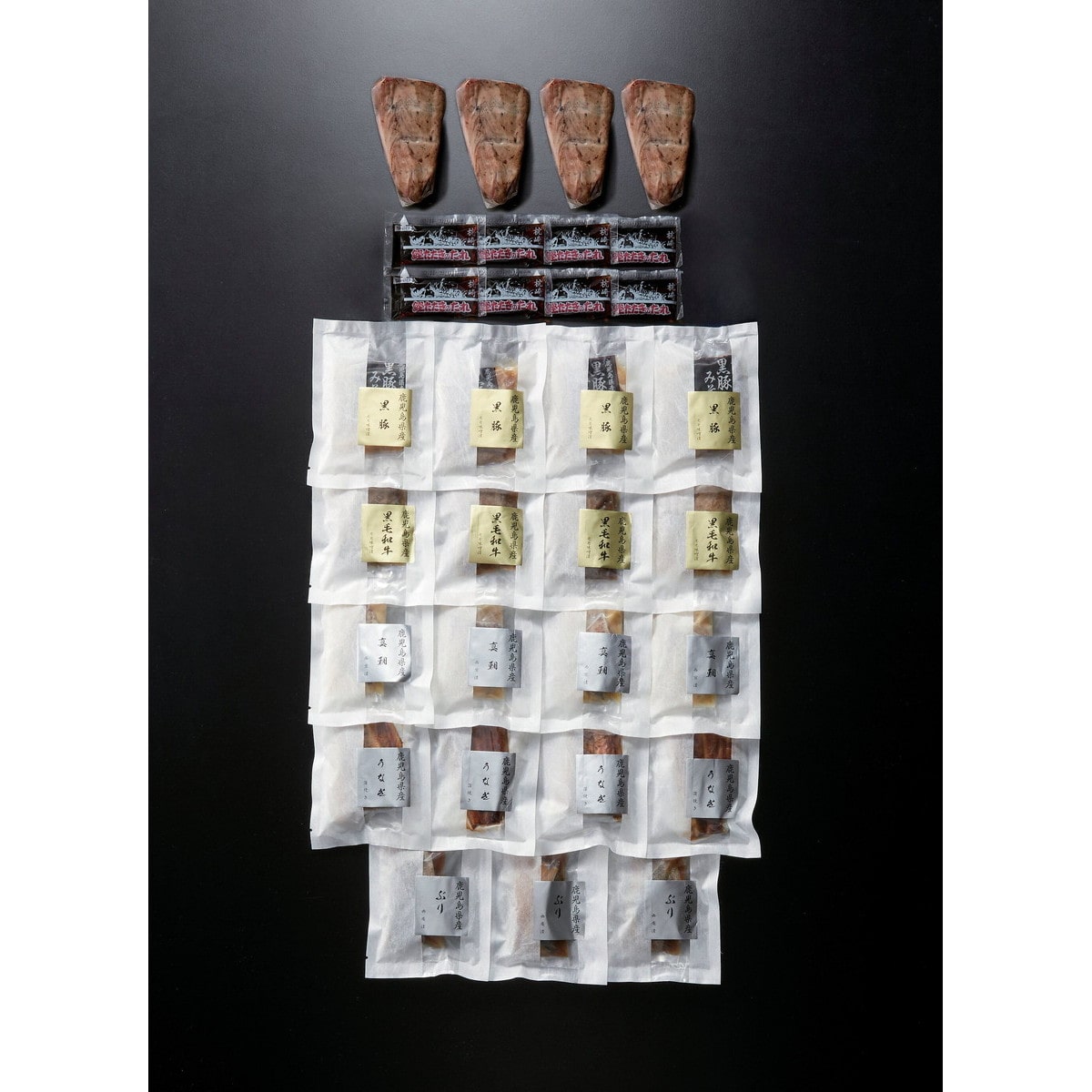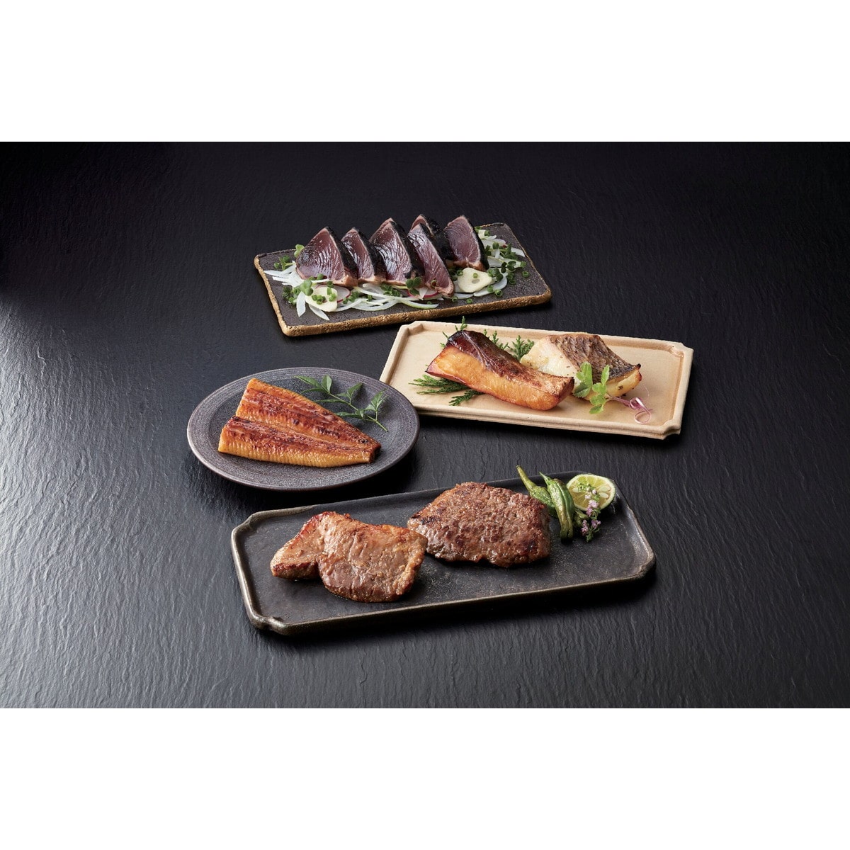 ●数量・内容:鰹たたき400g(計2~3本)×2、鰹たたきタレ×8、黒豚モモ味噌漬・黒毛和牛モモ味噌漬・真鯛西京漬各70g×4、鰻蒲焼60g×4、ぶり幽庵漬60g×3