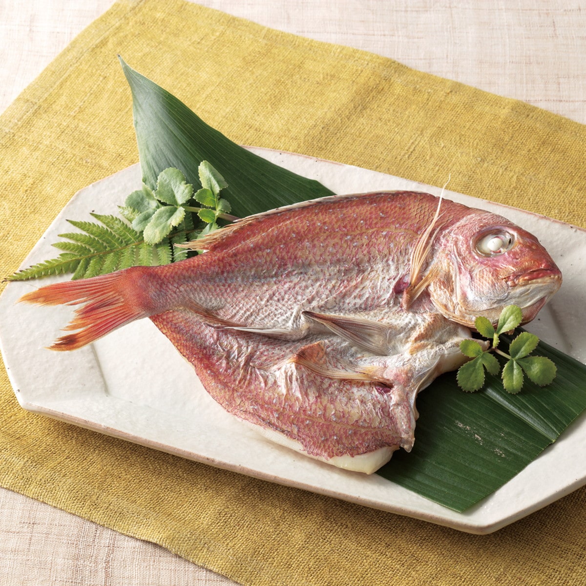 「天草天然真鯛ささ塩干」 豊穣の海に産する天然の真鯛。天草灘の滋味。使用している塩は自社製造の「ささ塩」。熊笹抽出液を塩に配合したこだわりの調味料です。天草の天然真鯛の美味しさをよりよく保つために「ささ塩」で一夜干しに仕上げています。