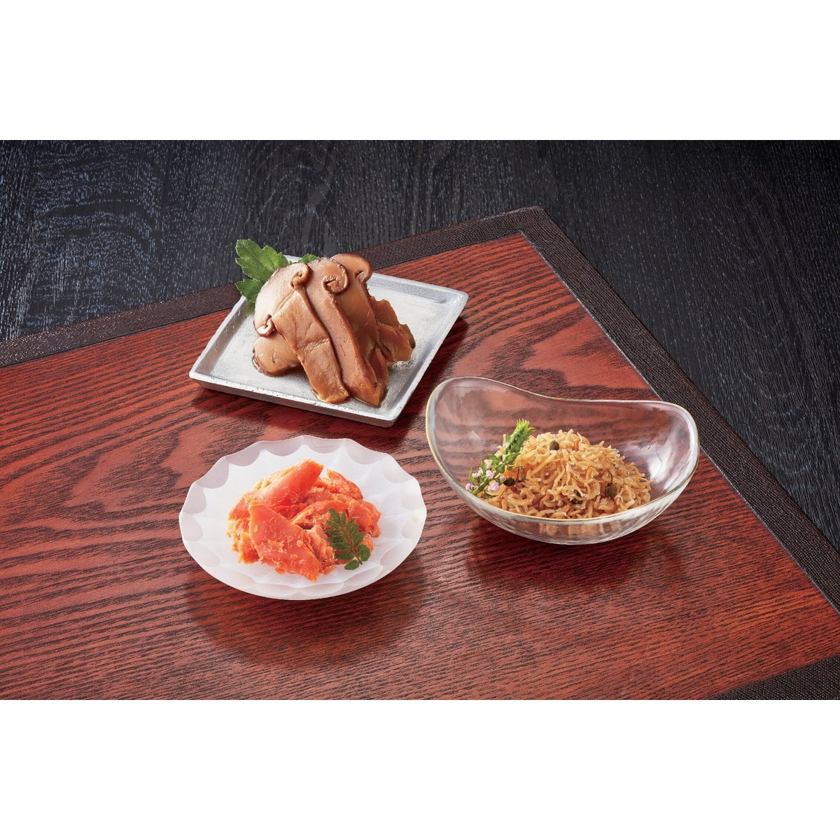 ●数量・内容:手選りちりめん山椒120g×2、松茸沢煮50g×1、焼き紅鮭50g×2