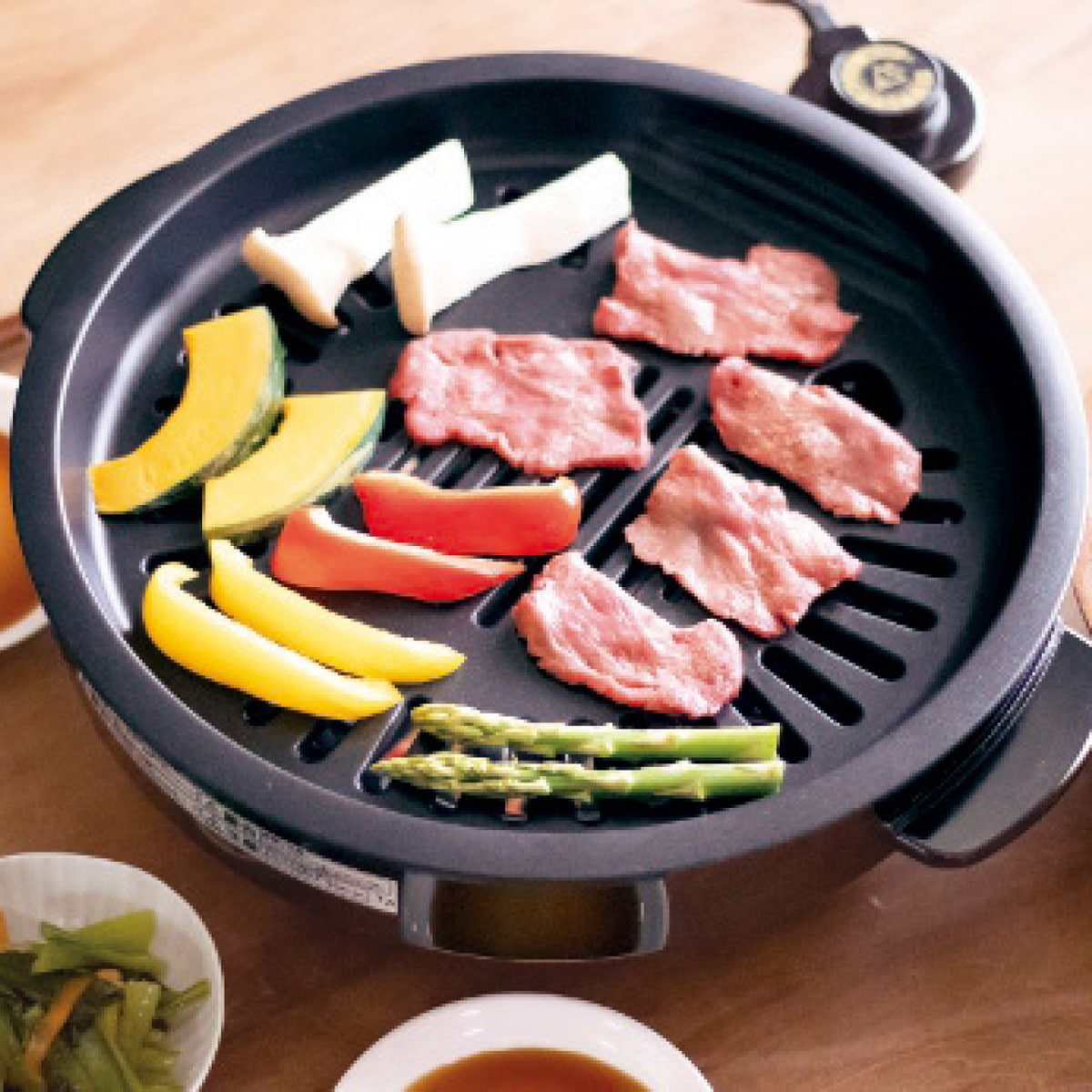 「消煙グリラー ヘルシートーク」 余分な油を落として煙を抑え、美味しくヘルシ-に焼き上げます。1200Wハイパワ-で一気に焼くので、旨味を逃さず美味しく焼けます。プレートが着脱式&フッ素樹脂加工なのでお手入れ簡単です。