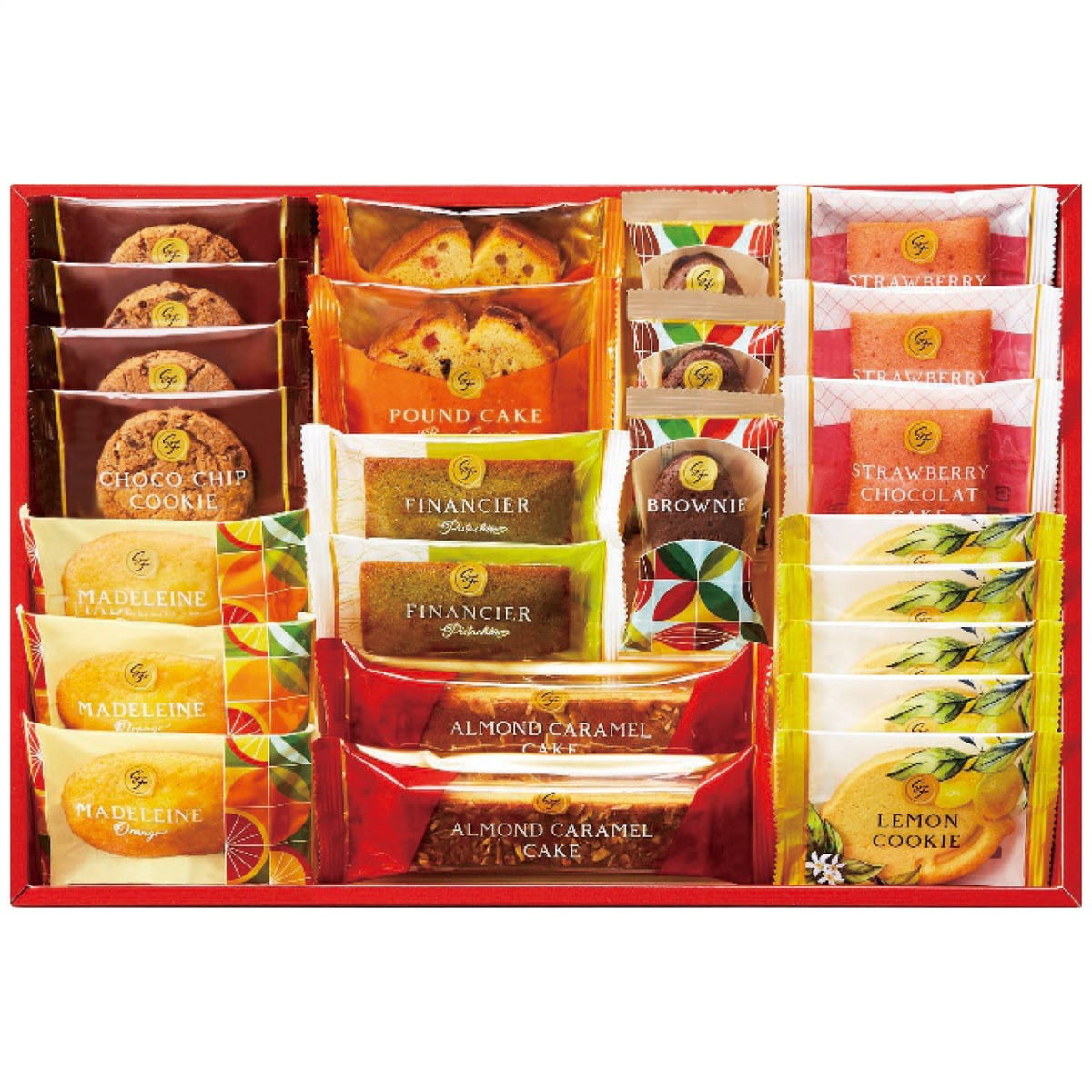 ●数量・内容:オレンジマドレーヌ・ブラウニー各3個・ケーキ(ストロベリーショコラ3個・ブラウンシュガーパウンド・アーモンドキャラメル各2個)・ピスタチオフィナンシェ2個・クッキー(チョコチップ4個・レモン5個)