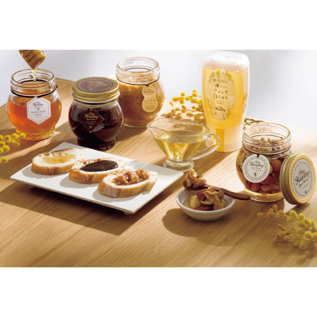 「MYHONEY ナッツの蜂蜜漬け&マヌカハニーブレンド&ハニーショコラ&ピーナッツハニーセット」 ナッツとはちみつの栄養が一度に摂れる、MYHONEYのナッツの蜂蜜漬け。栄養満点のナッツたちを、天然・非加熱のアカシアはちみつに漬け込みました。とろりとしたはちみつの程よい甘さとナッツの歯ごたえがクセになり、一度食べるととまらない美味しさ。そのままでも勿論、ヨーグルトやパンなど様々な食材に合わせて楽しめます。抗菌作用の高いマヌカ蜂蜜と非加熱のハンガリー産アカシアはちみつを食べやすくブレンドしたマヌカハニーブレンドは風邪のひき始めにのど飴のかわりにお召し上がりください。甘さははちみつだけ、乳製品不使用のハニーショコラ。パンやフルーツに、ホットミルクに溶かしてココアにしてもおすすめです。歯ごたえがあり人気のピーナッツハニーはパンと合わせたり、ドレッシングやお野菜の和え物にもおすすめです。