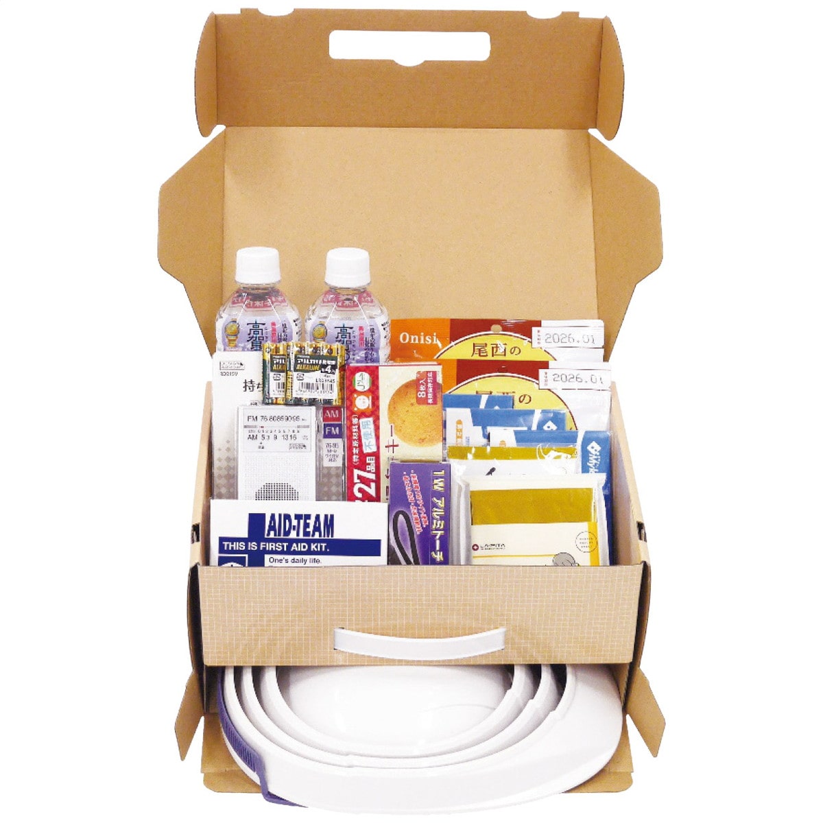 ●数量・内容:【セット内容】折りたたみ防災ヘルメット、レスキューシート、ライスクッキー、五目ごはん(アルファ米)、わかめごはん(アルファ米)、ライト、救急セット、ウェットティッシュ、ポケットラジオ (※以上 各1個)、簡易トイレ(1回分) 3個、7年保存水500ml×2本、単4電池(4本) 2個