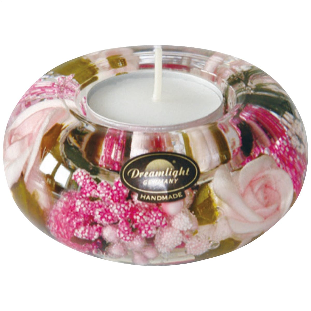 「ドリームライト キャンドルホルダー UFO(S) CDD2397(リトルローズ)」 1999年にドイツで誕生したドリームライトは、マウスブロウで成形したガラスの中に色とりどりのお花やオーナメントをジェルで閉じ込めた、ハンドメイドのキャンドルホルダーです。キャンドルとしてだけでなく、お部屋にお花を飾る様に、インテリアを華やかに演出するアイテムとしても活躍します。