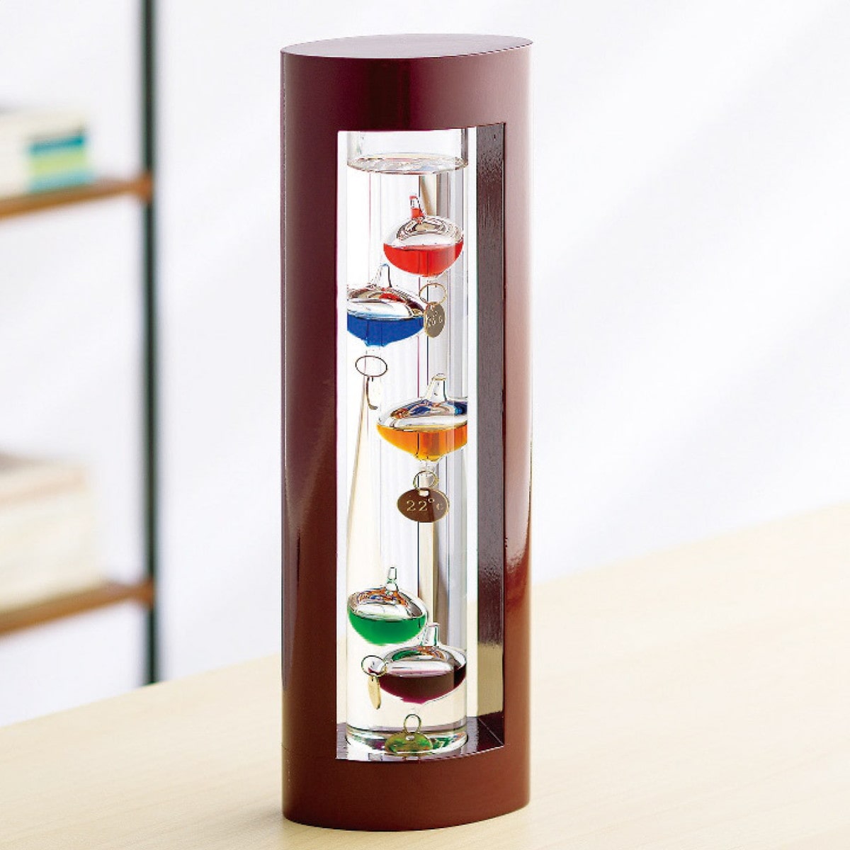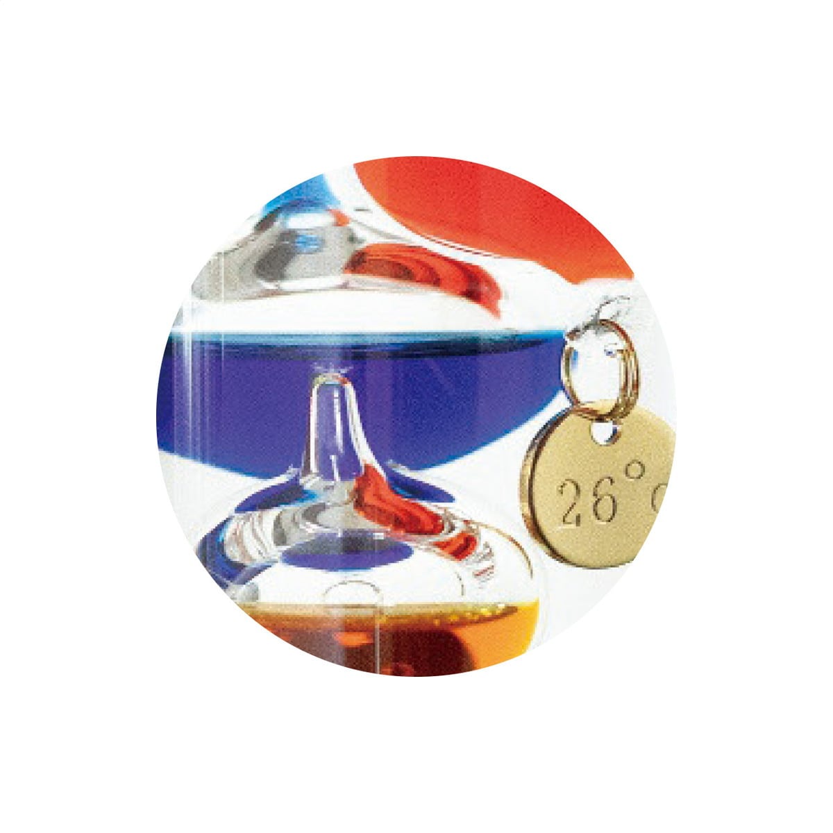 「ガラスフロート温度計」 物理学者のガリレオ・ガリレイが発見した「液体の比重が気温によって変化する」原理を用いて作られた温度計。ガリレオ温度計とも呼ばれます。実際の気温は上層部に浮いているガラス球体の最下段のガラス球体に付いているプレートで読み取ります。