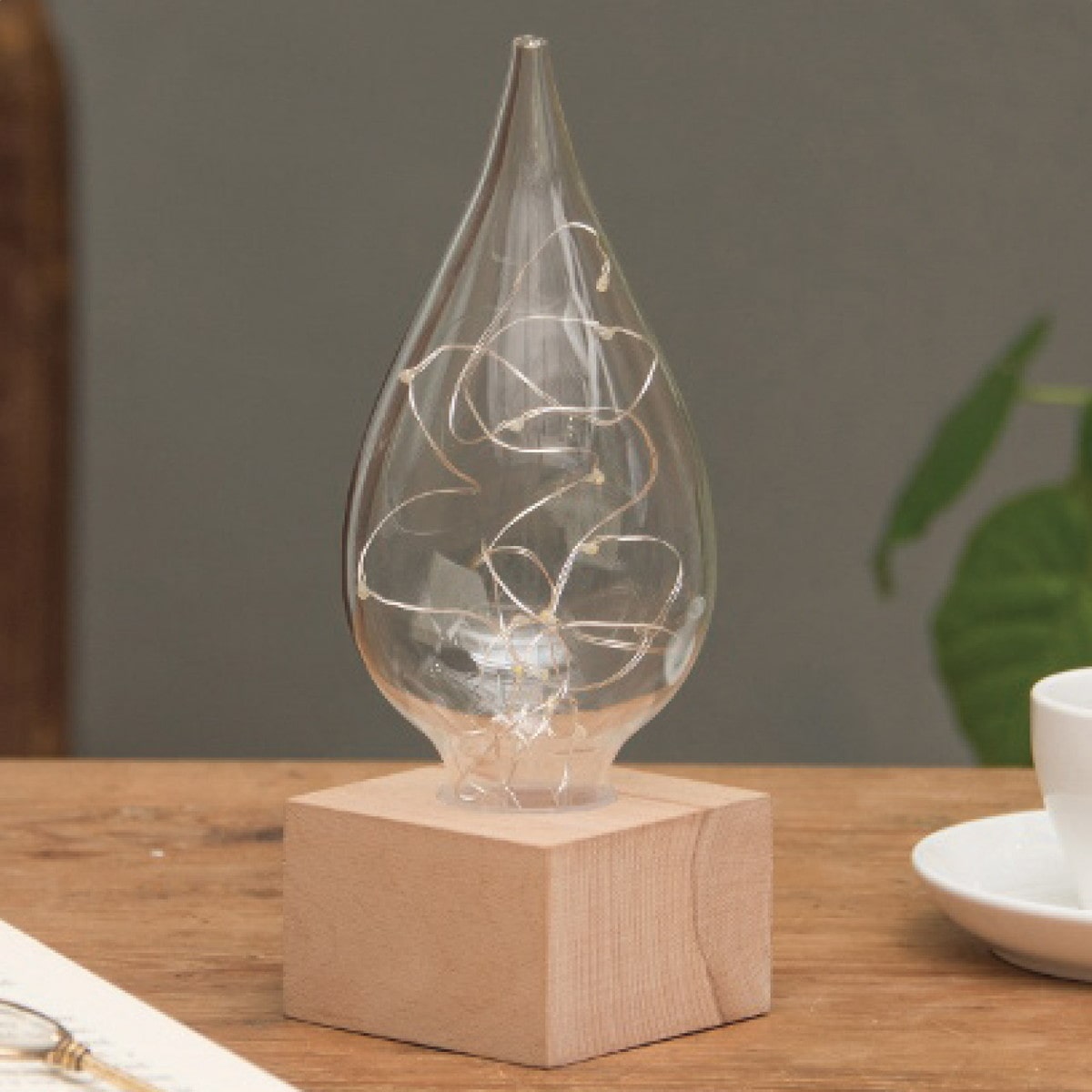 「LEDライト しずく」 シンプルながら、お部屋のどこに置いても不思議な存在感を放つしずく型のLEDライト。ガラスとライト、そして木という異素材の組合せが新鮮な上、過度な色やデザインを省いたデザインなので飽きることはありません。柔らかな光でリラックス、いつでもそばに置けるコードレス仕様なのも嬉しいポイントです。