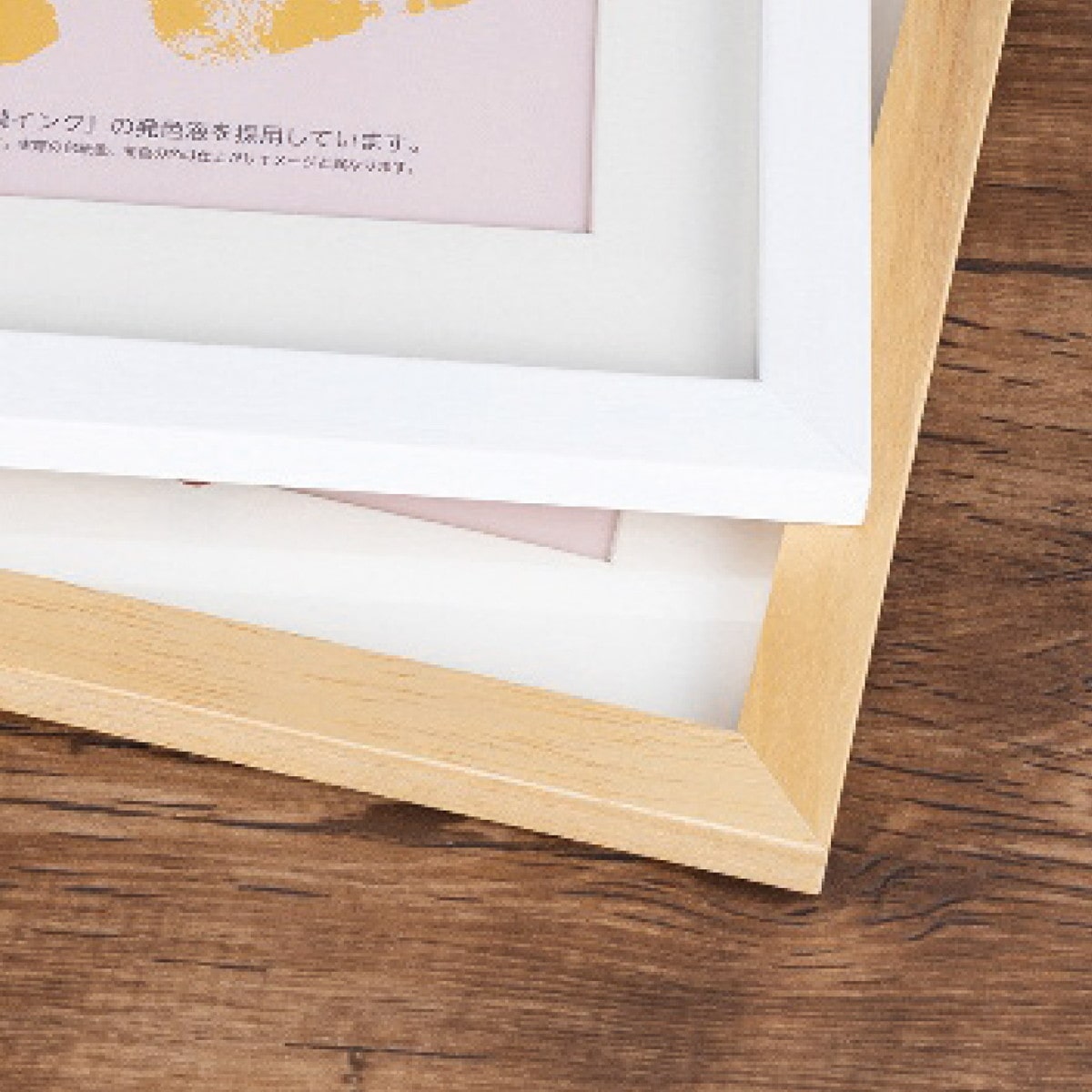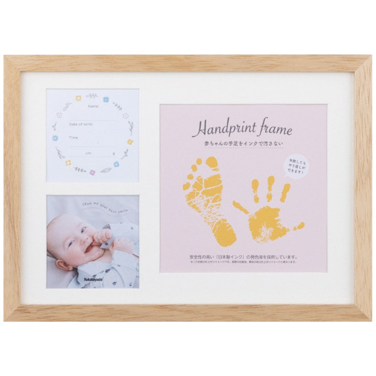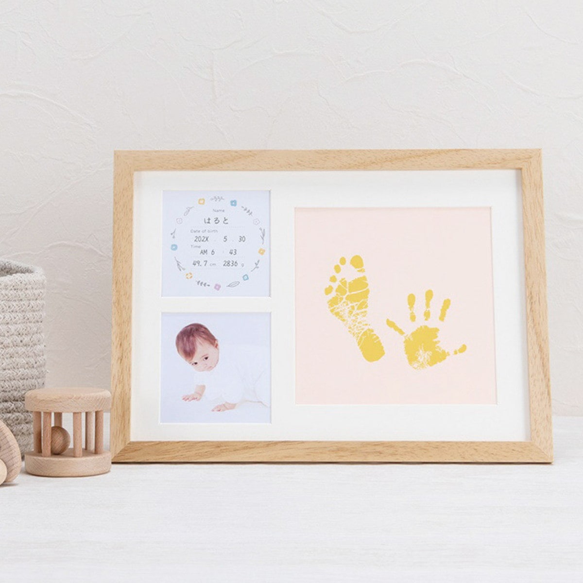 「手形足形木製フォトフレーム(ナチュラル)」 写真と一緒に手形・足形を残せるフォトフレームです。身近な人や大切な人へ贈る記念品として、また大切な記念日をカタチとして残すのに最適です。赤ちゃんの手足をインクで汚さずに、手形足形が残せます。失敗してもやり直しが可能です。安全性の高い「日本製インク」の発色液を採用しています。お名前や誕生の記録を書き込むことができる記録スペース付き。<ご使用上の注意>お子様の手足のサイズによっては発色紙に手形足形が入り切らない場合があります。窓寸法をご確認ください。