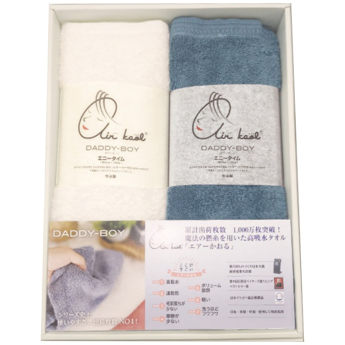 「エアーかおる ダディボーイ ハーフバスタオル2枚セット 」 特許取得の糸加工「スーパーゼロ」を使用することにより、吸水力1.5倍、2倍速い速乾性、脱毛率1/10の少なさ、ボリューム感抜群、洗うほどにふわふわな風合いなど多くの機能性を実現。肌や髪に対する摩擦も極めて少ないため、アトピー協会推薦品でもある。敏感肌の方や赤ちゃんにも安心。