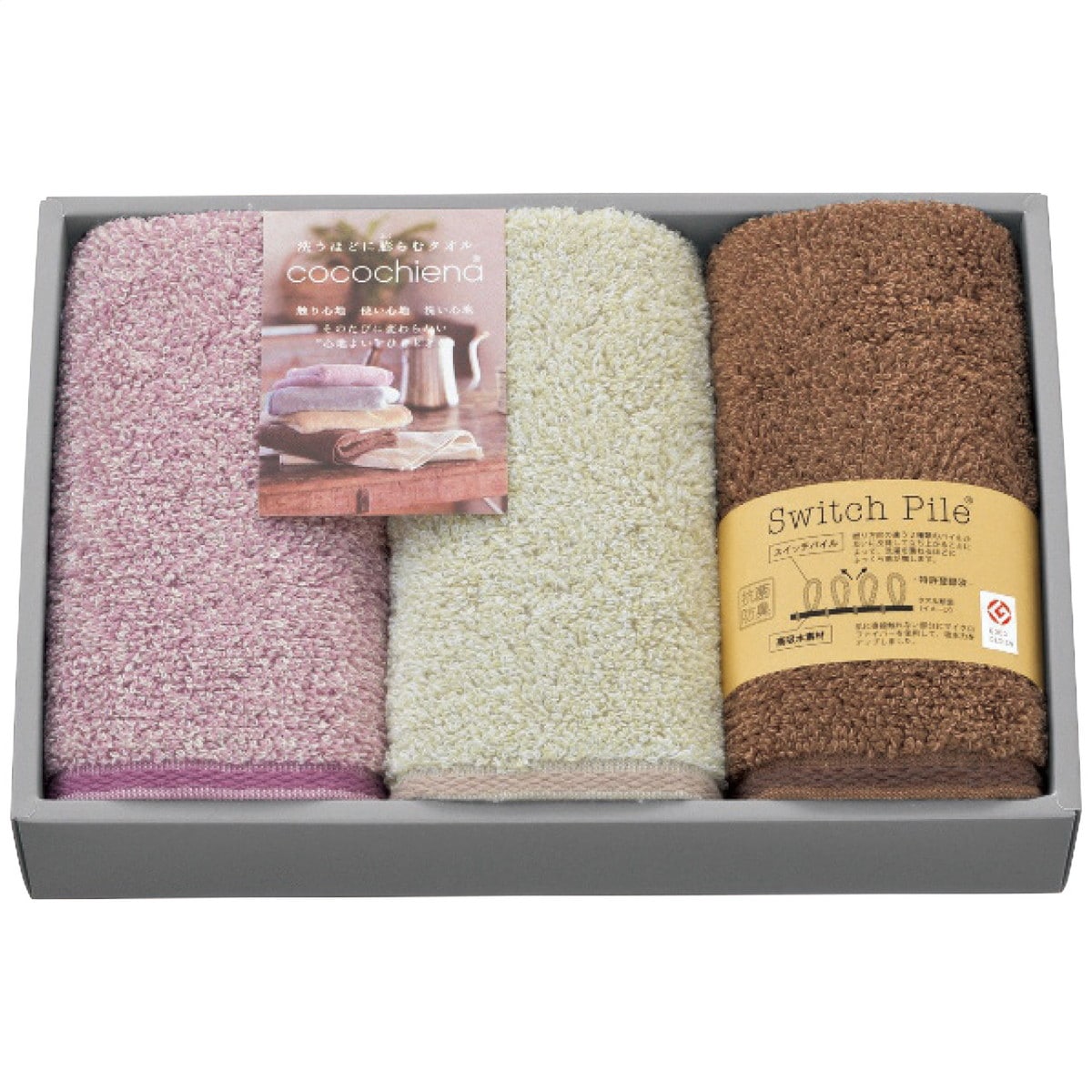 「ココチエナ フェイスタオル3枚セット CE2581」 スイッチパイルという特許技術を使っており、洗ってもパイルがへたりにくく、膨らみのある風合いを持続させます。お肌に触れるパイルは綿100%。中に隠れている部分にマイクロファイバー混紡の高吸水糸を使用しており、吸水発散を更に促します。甘撚り糸の柔らかい風合いも特徴です。