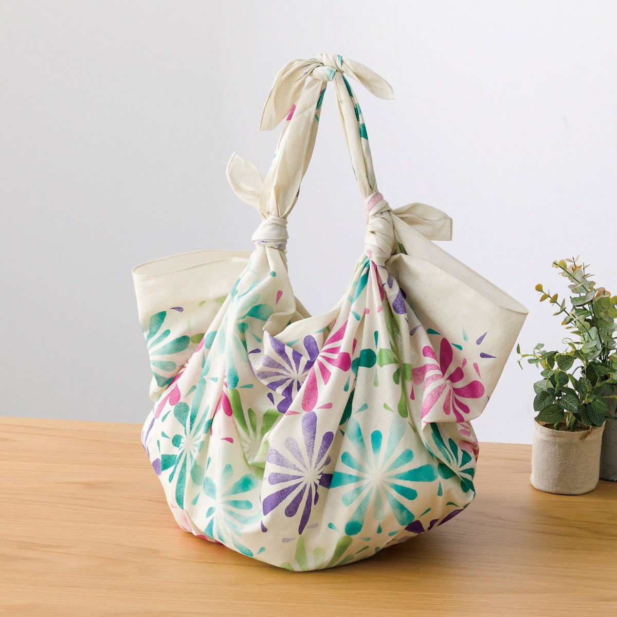「撥水ふろしき 053404(万華鏡)」 軽くて柔らかい綿ふろしきに撥水加工を施したふろしき。ものを包むだけでなく、結んでエコバッグにしたり、ストールやショールのように使ったり、インテリアに使ったり、様々な用途で暮らしを彩ります。アウトドアのお供や防災用途にも。