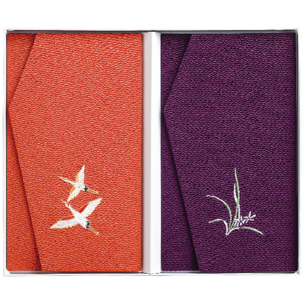 「丹後ちりめん 慶弔金封ふくさ2枚セット」 京都の丹後地方で織られたちりめん生地に細やかな刺繍をあしらった金封袱紗。ご家庭に一つ持っていると重宝する慶事用・弔事用のセットです。