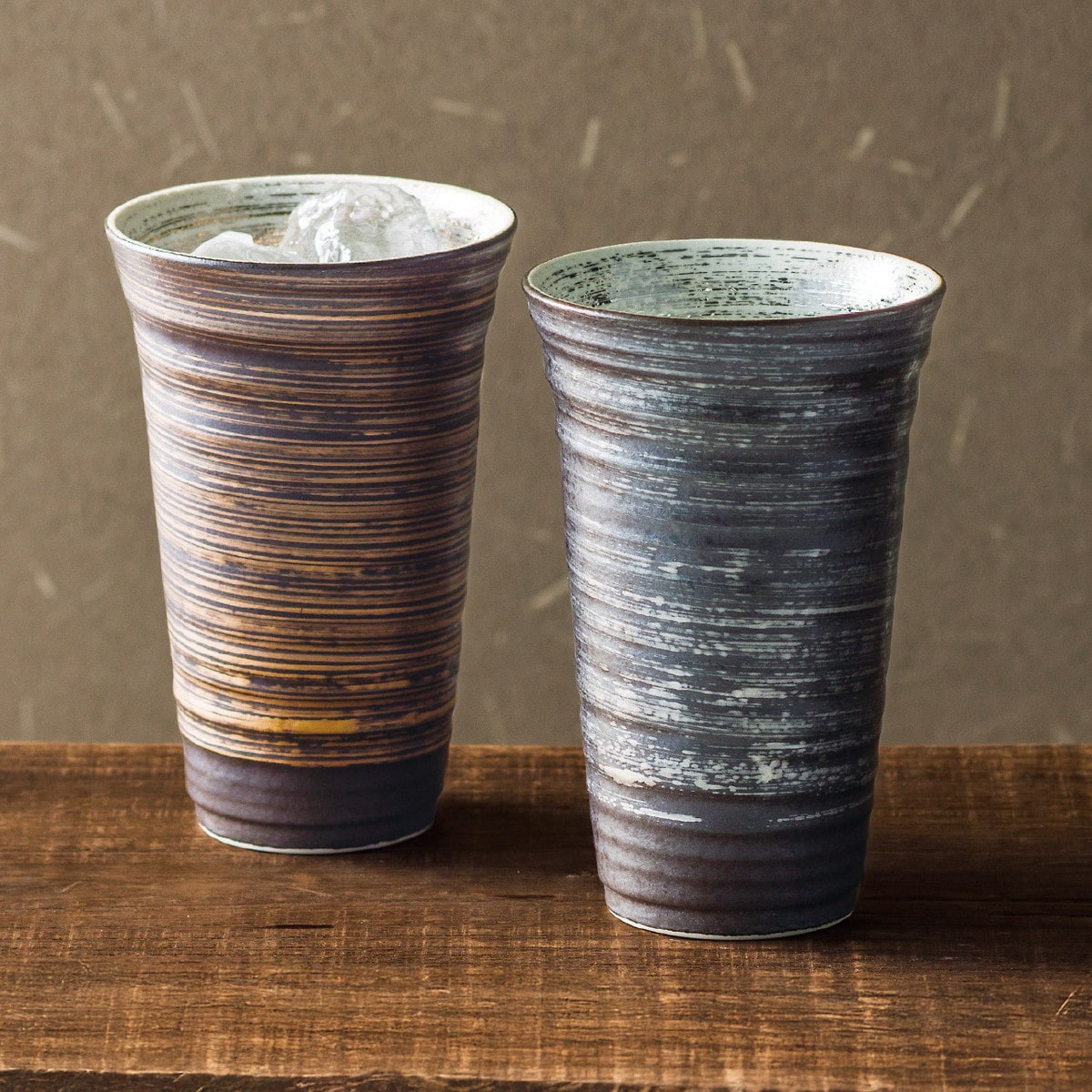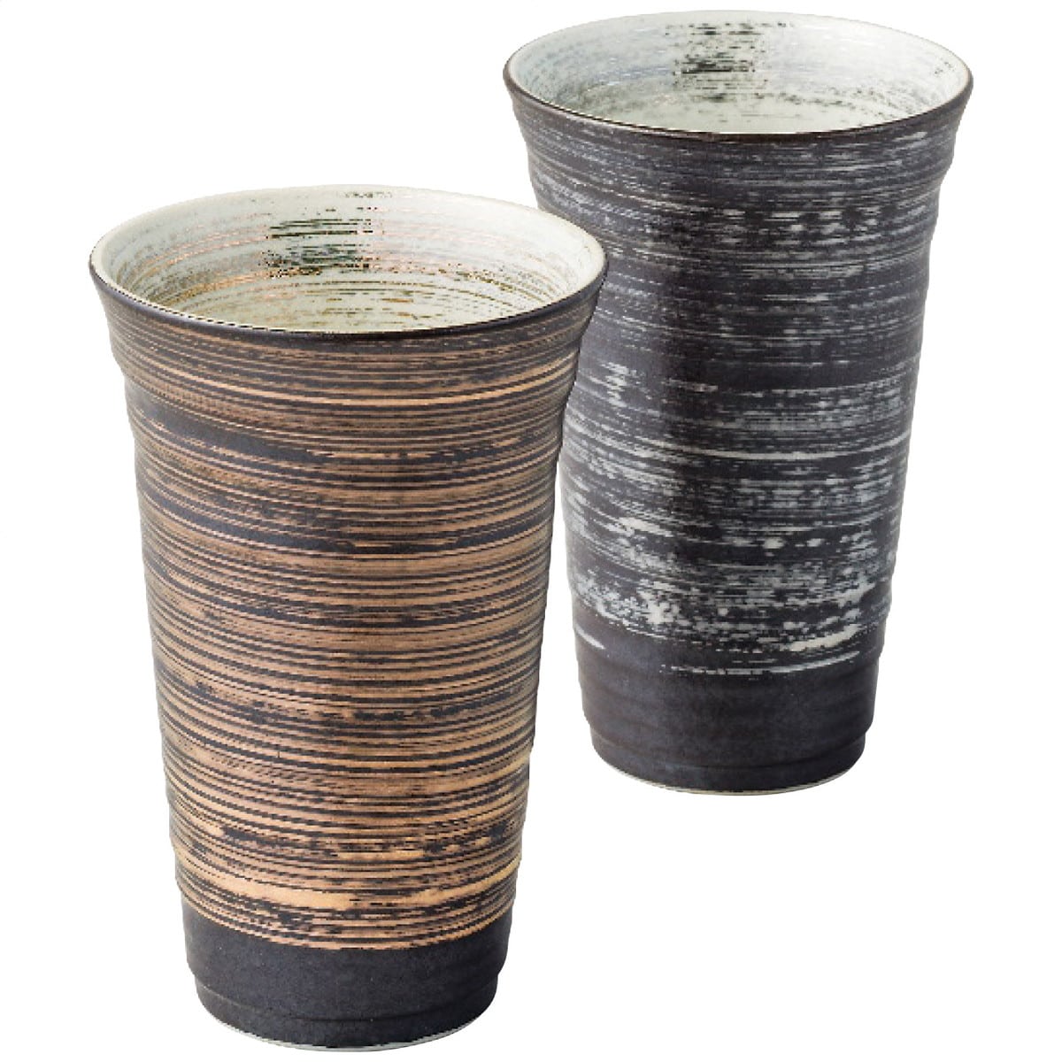 「有田焼 金銀刷毛 反型ペアビアカップ(大)」 抑えた色に金と銀を品よくあしらったゴージャスな逸品。シンプルな形がなめらかな刷毛のラインで一段と映えています。