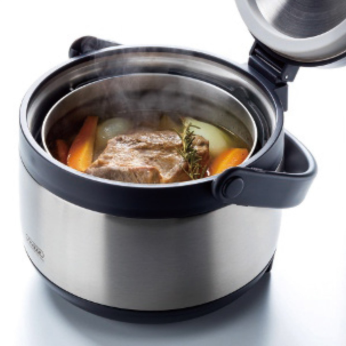 「真空保温調理鍋」 保温器のフタと本体に真空断熱構造を採用し、高い保温力を発揮します。火にかける時間が少ないからガスや電気代の節約になります。調理器で短時間加熱後に、保温器に移して余熱で素材に熱を通して調理できるので、保温調理の間は時間を有効利用できて省エネにも効果的です。保温調理だけでなく、「保冷」にも使えます。ジュースや氷など。アウトドアシーンでもとても便利です。レシピブック付き。