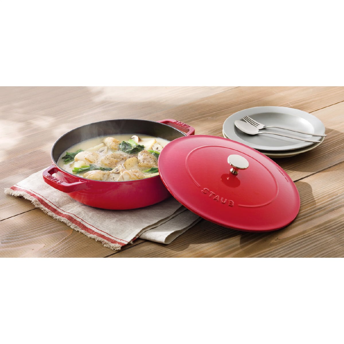 「ストウブ ブレイザーソテーパン24cm 40511-475-0(チェリー)」 食材から出た水分をキャッチして食材に投げ返すブレイザーソテーパン。浅めの鍋にドーム型の蓋が「炒めて煮込む」料理に適しています。通常ドーム型の蓋の鍋は、調理中、食材からの水分が上にあがり水滴になり、鍋の端へ流れてしまいます。ブレイザーはその問題を解決するために食材から出た水分をキャッチして食材に投げ返す「システラドロップ構造」で料理を更に美味しくします。テーブルにお鍋のままお出しいただくと、お料理が冷めにくく温かい状態を保ちます。また熱伝導が優れているので、必要最低限の熱で調理が可能です。