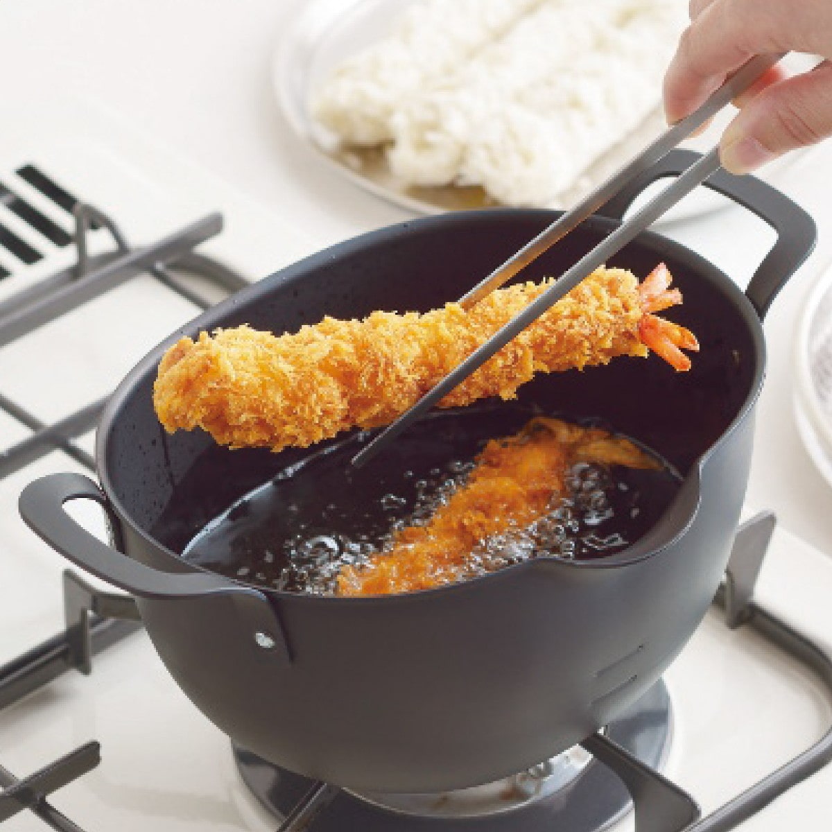 「アイカタ 鉄製揚げ鍋」 コンパクトだけどストレス無くお使いいただける鉄製揚げ鍋。楕円形のフォルムなので少なめの油でも、楽々と揚げ物料理が出来ます。ボリュームのあるトンカツや魚のフライ、長さのあるエビやアスパラガス等の揚げ物にもおすすめ。注ぎやすいワイドな注ぎ口と両手でしっかり握れる取っ手で油の移し替えも楽々。