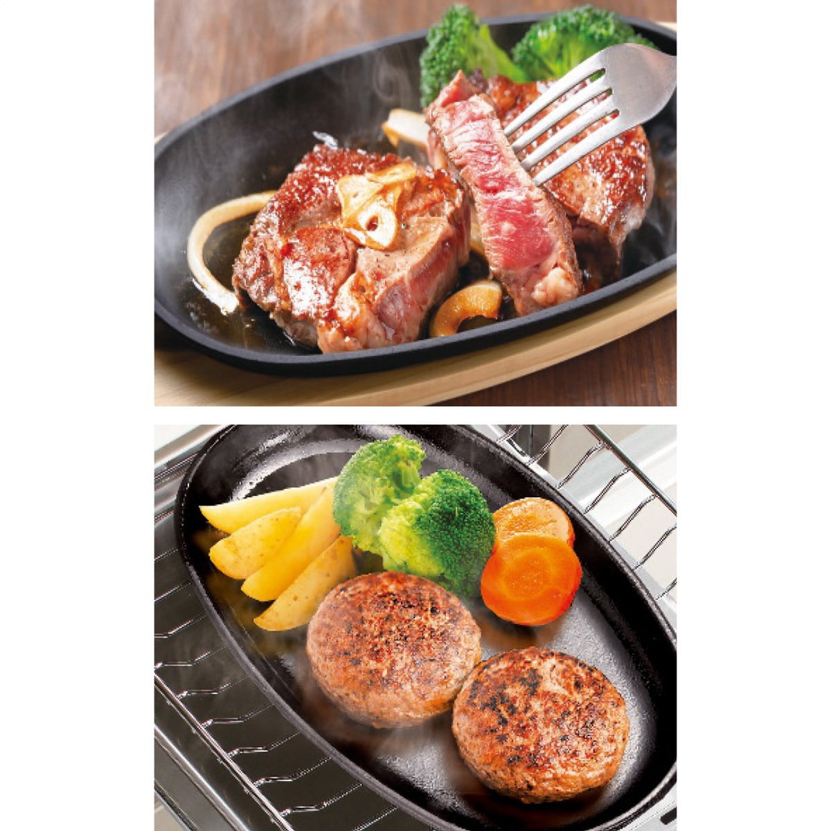 「鉄鋳物小判ステーキ2枚セット」 鉄鋳物は保温性が高く、熱々が長続き。ハンドルと敷板付で持ち運びに便利。IH、直火、オーブン対応。