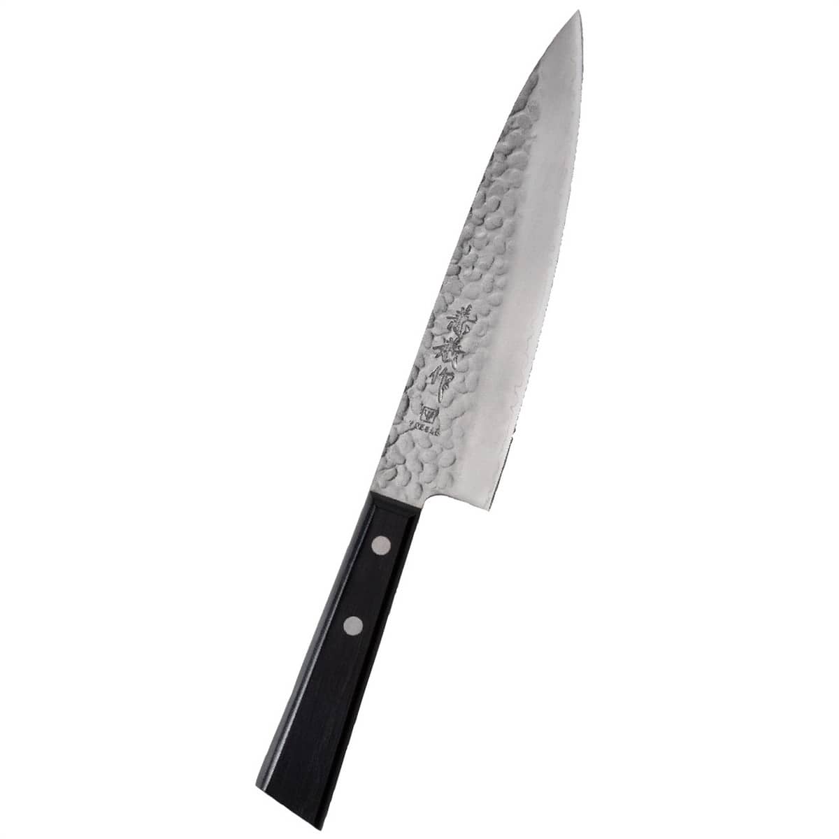 「兼義作 VG10鎚目クラド シェフナイフ」 高級刃物鋼VG10をステンレスで挟み込んだ3層鋼ブレードで鋭い切れ味が持続する包丁です。ブレードの鎚目により切り離れも良く、コストパフォーマンスに優れた本格的な包丁です。