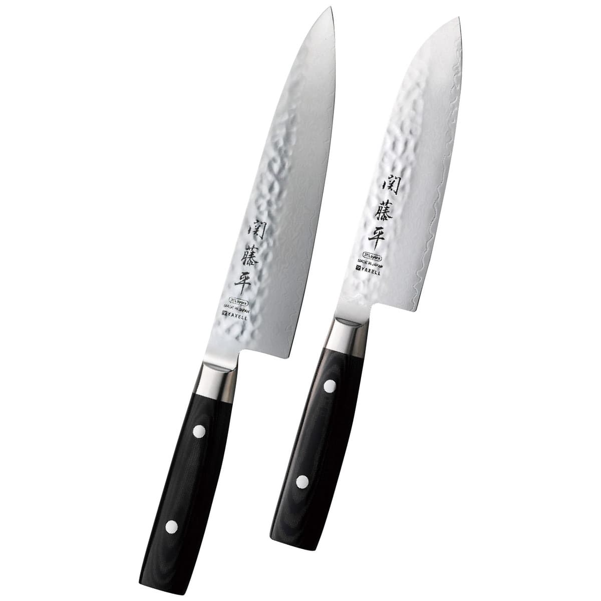 「関藤平 ダマスカス鋼包丁2本セット」 美しい紋様が浮かび上がるダマスカス鋼ブレードは芯材にコバルト合金を使用しており鋭い切れ味が長く続きます。ブレードと口金は一体溶接仕様で繋ぎ目が無く汚れが溜らず衛生的です。ハンドルには耐水性に優れるカンバスマイカルタを使用し、使うほどに手になじみます。刃物の産地、岐阜県関市の鍛え抜かれた包丁職人が一本一本手作業で仕上げを行いますのでブレード、ハンドルに浮かび上がる紋様は1つずつ異なります。
