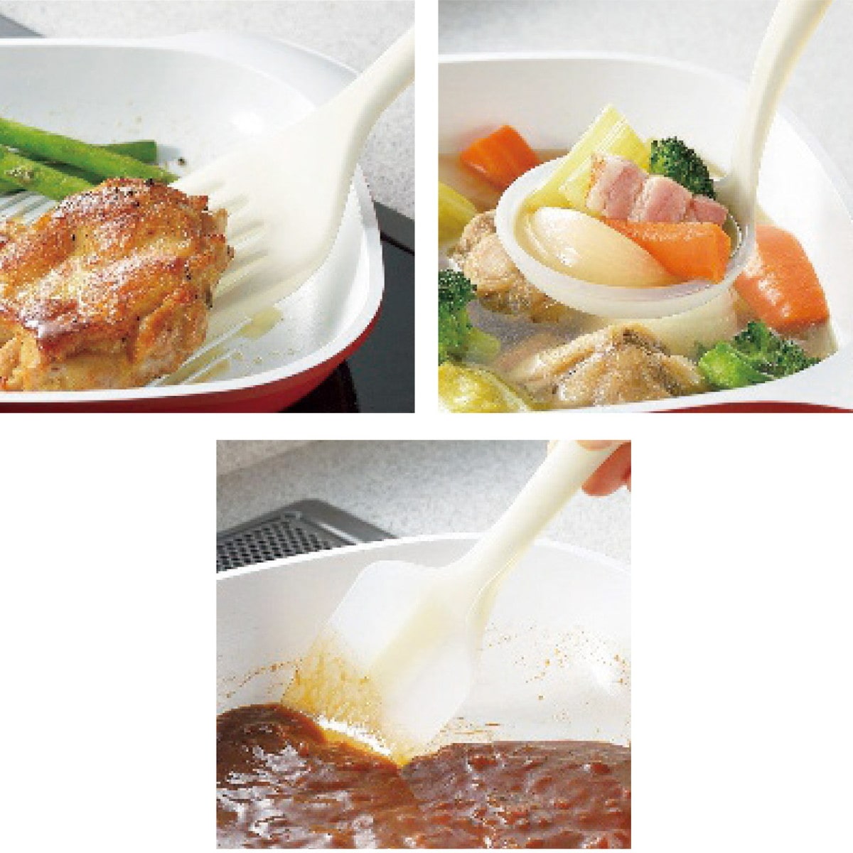 ●数量・内容:30.5×8.2cmターナー・26×9cmレードル・26×6.3cmスパチュラ各1本・本体:シリコーンゴム・芯材:ナイロン