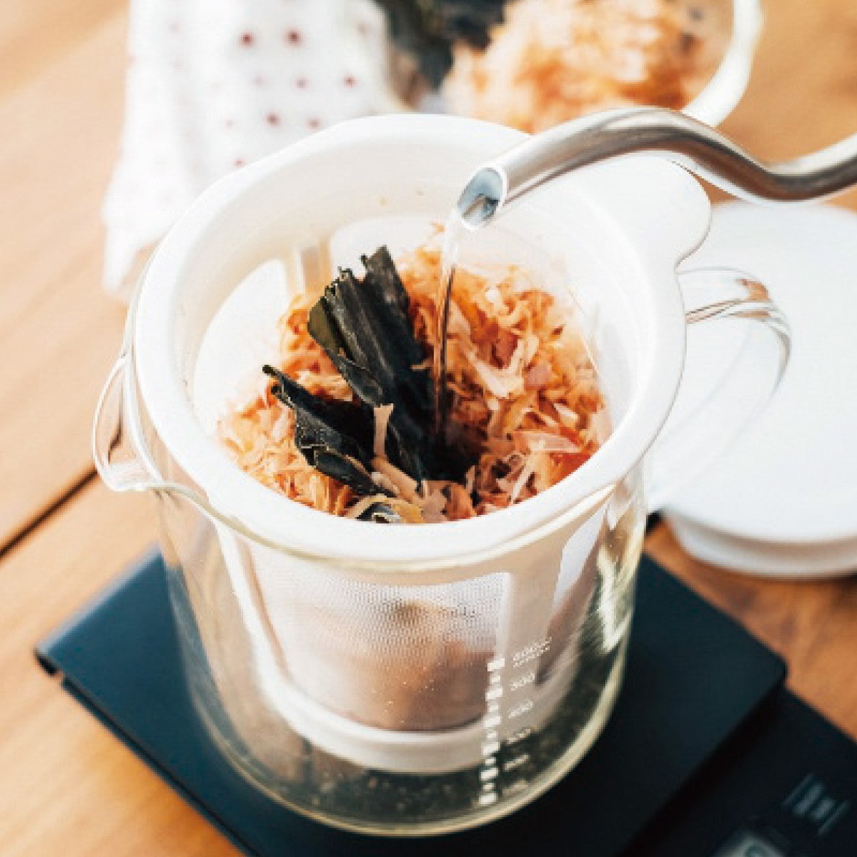 「ハリオ だしポット」 ポットの底まで届く大きなストレーナーで、だしをしっかり抽出。ストレーナーのへこみ部をポットの縁に引っ掛けて、最後の一滴まで抽出します。口が広いので洗いやすくて衛生的にお使いいただけます。オリジナルレシピ付き。