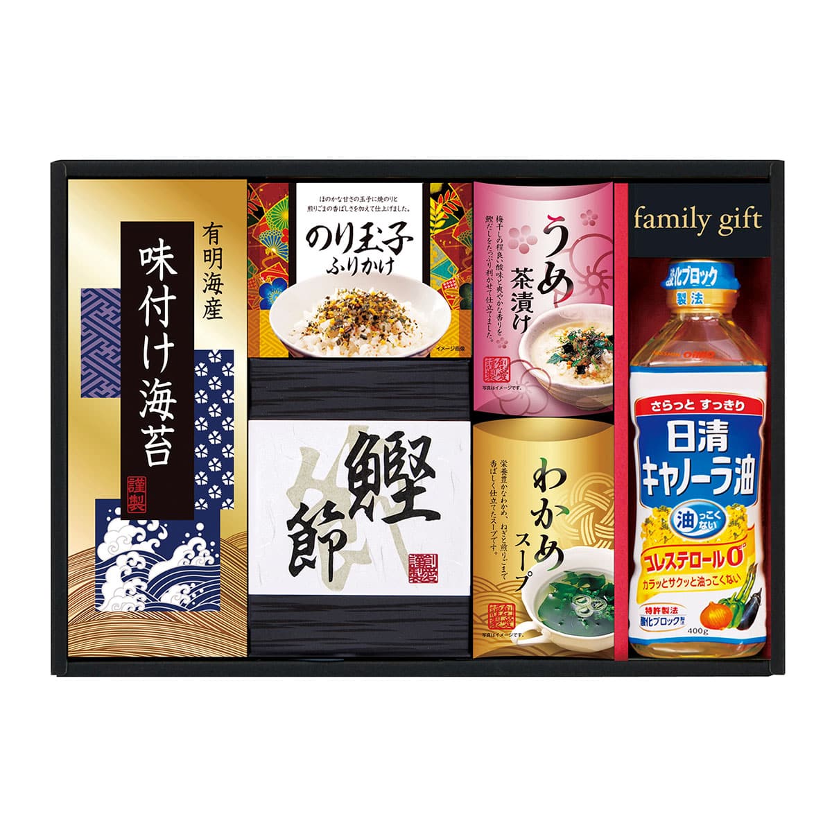 ●数量・内容:(有明海産味付け海苔(3切6枚)・のり玉子ふりかけ(4.5g×2袋)・鰹節削り(2g×4袋)・うめ茶漬け(4.3g×2袋)・わかめスープ(5.3g×2袋)・日清キャノーラ油400g 【卵・乳成分・小麦・えび】)×2