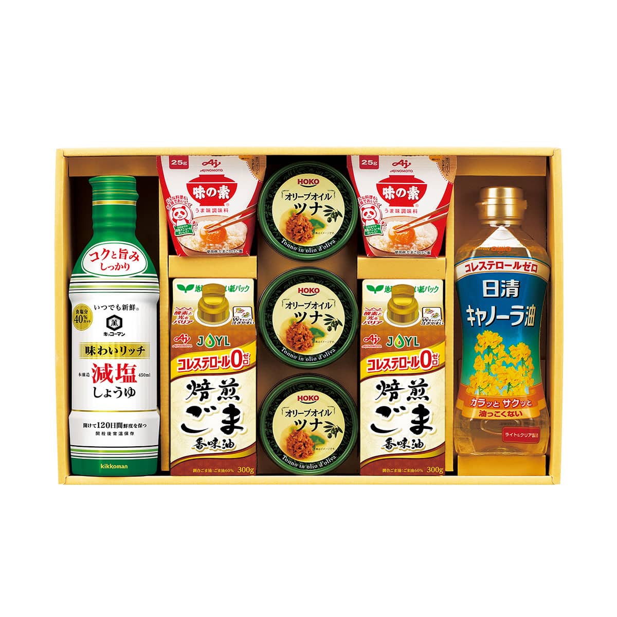 ●数量・内容:(日清キャノーラ油350g・キッコーマンいつでも新鮮味わいリッチ減塩しょうゆ450ml・宝幸オリーブオイルライトツナフレーク(まぐろ油漬)70g×3・味の素焙煎ごま香味油300g×2・味の素25g×2 【小麦】)×2