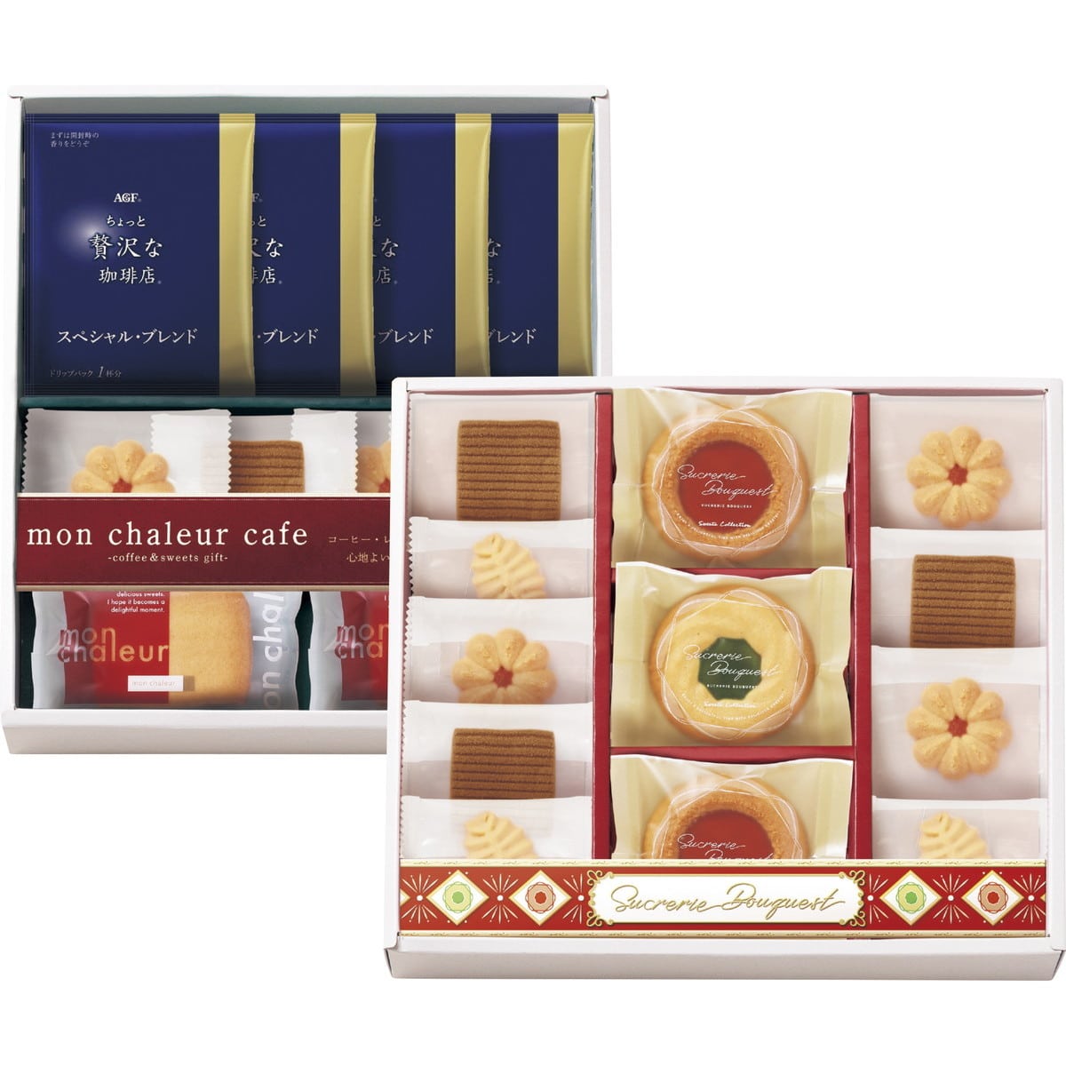 [シュクルリブーケ ベイクドクッキー・レーズンサンド・ドリップコーヒーセット BCRT-40] 愛され続ける美味しさ二度焼した2種類のクッキー生地に、フルーツジャムでデコレーションした素朴で懐かしい「ベイクドクッキー」やさっくりと焼き上げたサブレ生地に、ラム酒のシロップに漬け込んだ柔らかなレーズンとくちどけなめらかなホワイトクリームをサンドした「レーズンサンド」、素材の持ち味を生かして焼き上げた、上品な味わいのクッキーの詰合せ。