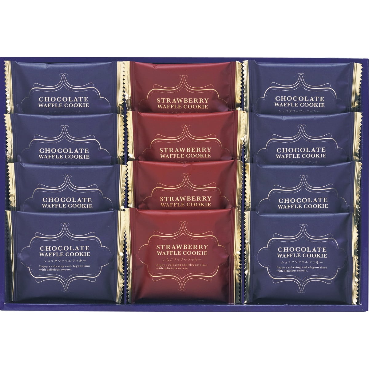 [3セットでお届け スイートバスケット ワッフルクッキー W-AE] サクサク食感のワッフルクッキーにホワイトチョコクリームを詰めた風味豊かなショコラワッフルクッキーといちごチョコクリームを詰めたいちごワッフルクッキーの詰合せです。