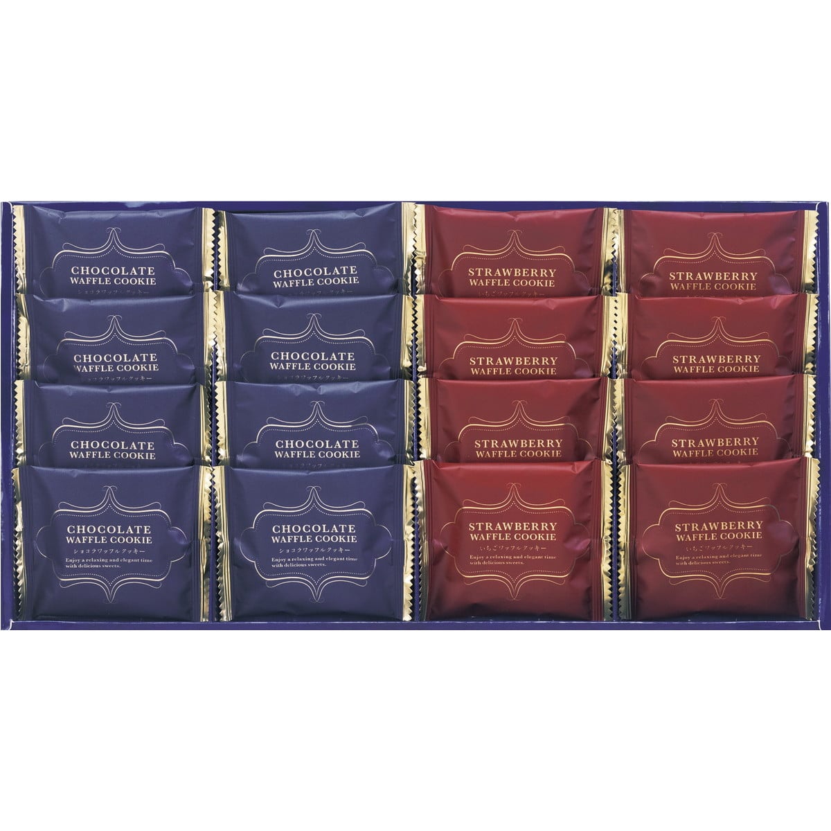 [2セットでお届け スイートバスケット ワッフルクッキー W-BO] サクサク食感のワッフルクッキーにホワイトチョコクリームを詰めた風味豊かなショコラワッフルクッキーといちごチョコクリームを詰めたいちごワッフルクッキーの詰合せです。