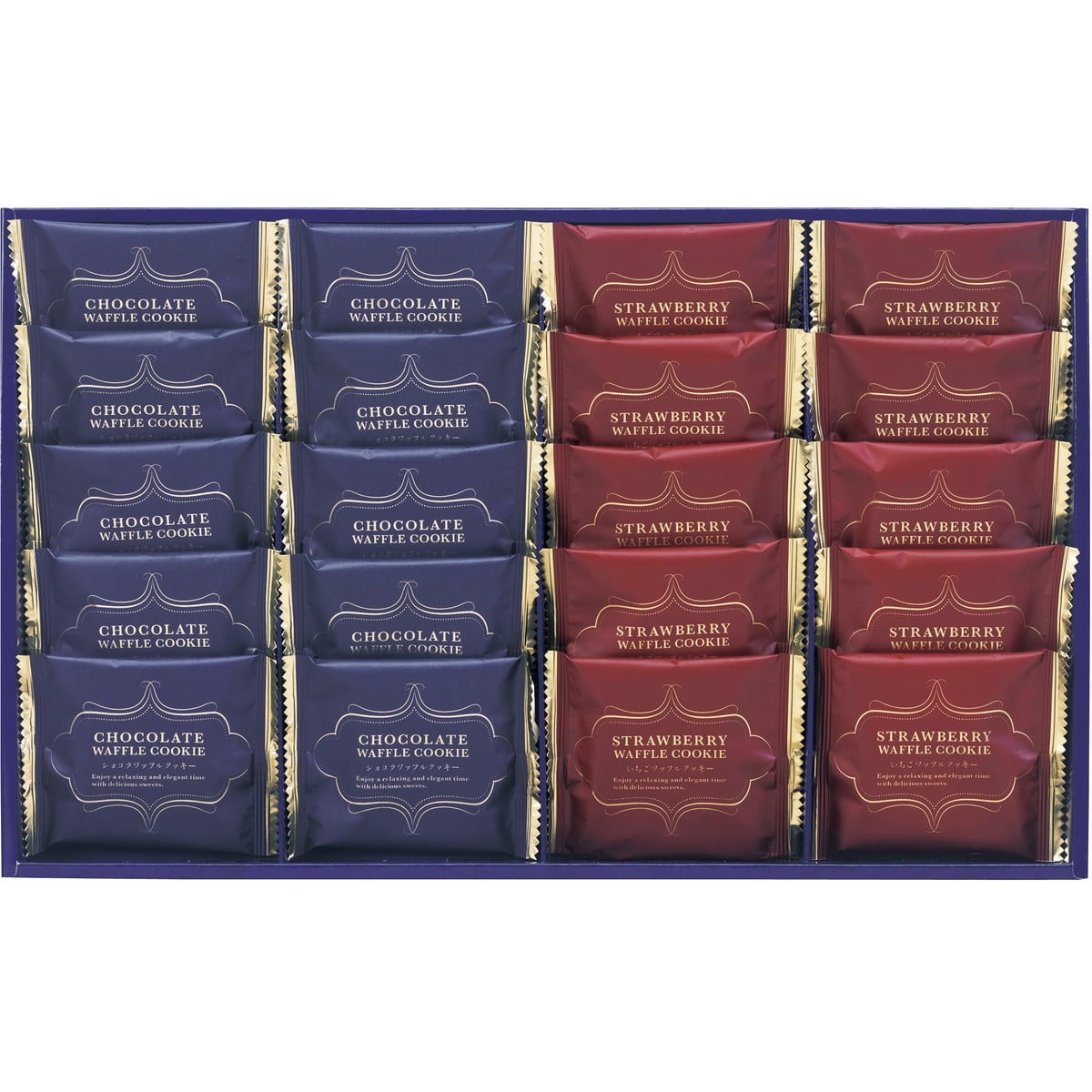 [2セットでお届け スイートバスケット ワッフルクッキー W-BE] サクサク食感のワッフルクッキーにホワイトチョコクリームを詰めた風味豊かなショコラワッフルクッキーといちごチョコクリームを詰めたいちごワッフルクッキーの詰合せです。
