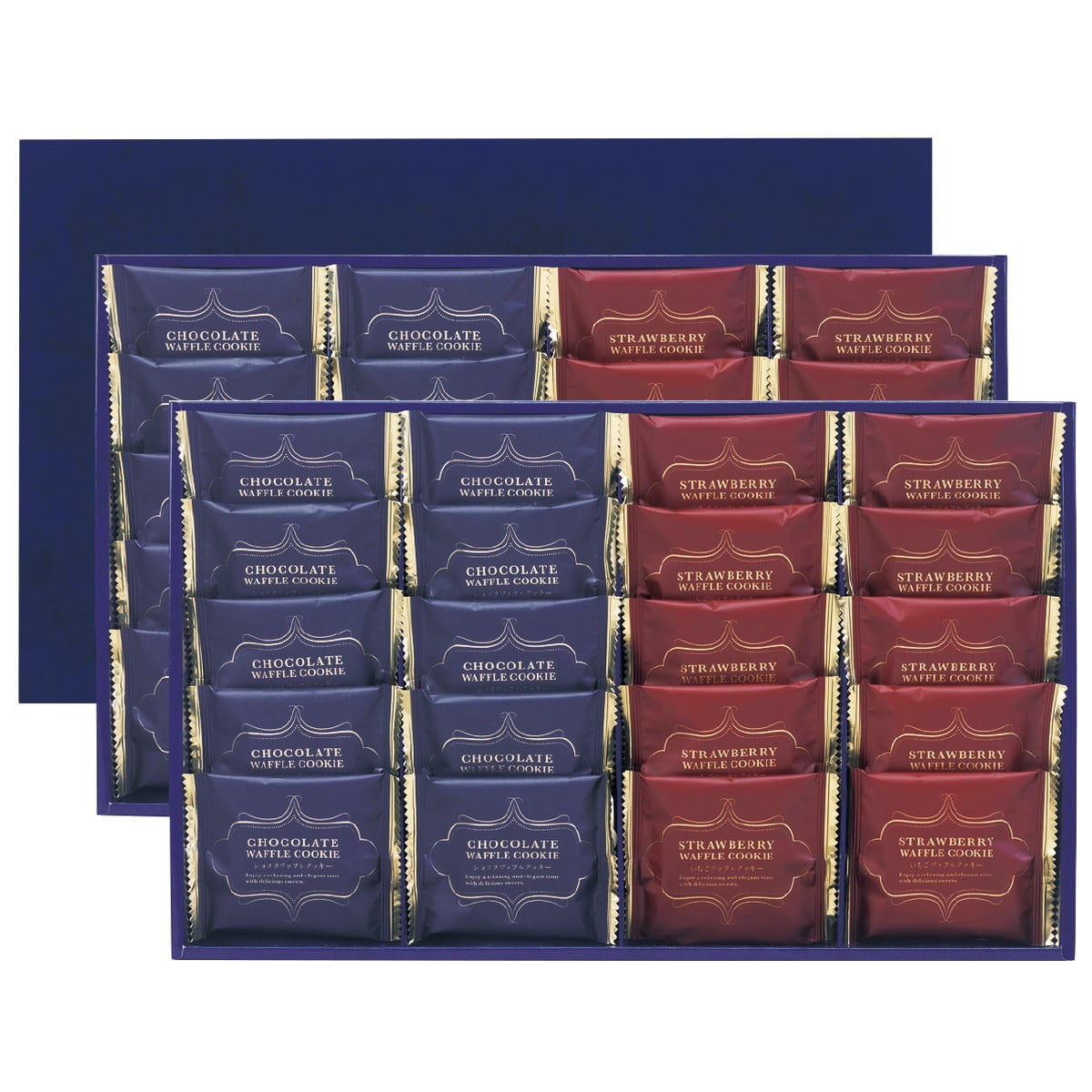 [スイートバスケット ワッフルクッキー W-EO] サクサク食感のワッフルクッキーにホワイトチョコクリームを詰めた風味豊かなショコラワッフルクッキーといちごチョコクリームを詰めたいちごワッフルクッキーの詰合せです。