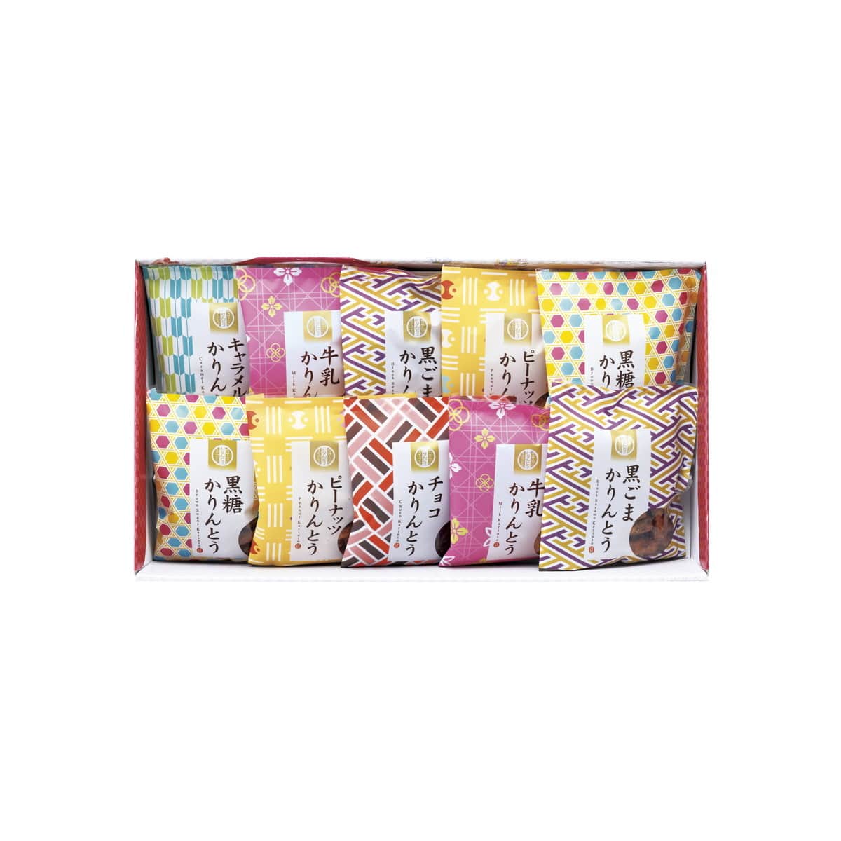 [2セットでお届け かりんとう詰合せ AY-BE] 様々なフレーバーを楽しめるかりんとうの詰合せです。黒ごまかりんとう香ばしい黒ごまで風味豊かに仕上げました。チョコかりんとうチョコレートを生地にたっぷりと練り込み、カリッとかる~い食感に仕上げました。キャラメルかりんとうキャラメルを生地にたっぷりとかけ、しっとりと仕上げました。ピーナッツかりんとうピーナッツの香ばしさと甘みを調和させ、味わい深く仕上げました。牛乳かりんとう牛乳を生地に練り込み、サクッと軽い食感に仕上げました。黒糖かりんとう風味豊かなハチミツ入りで、サクサクッとした食感に仕上げました。