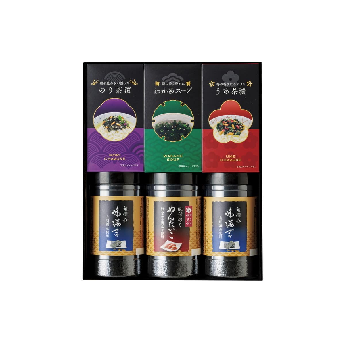 ●数量・内容:有明海産味海苔6袋詰(8切4枚)×2・食卓のやまや博多辛子明太子味海苔(8切24枚)・のり茶漬け(5g×4袋)・うめ茶漬け(5g×4袋)・わかめスープ(3.5g×4袋) 【乳成分・小麦・えび】 2セット
